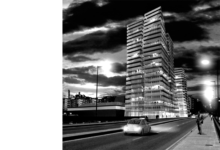 The competition expects 27290,31m2 of roofing above gradient in a municipal plot, the facade faces Segre river and the future "Palau de Congressos de la Llotja"'s building. The draft is adapted to two tower versions, one of ground floor + 15 (A) and another of ground floor + 21 (B), anticipated as an regulation alternative to the modification of Lleida's "General Plan"