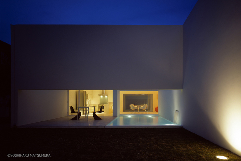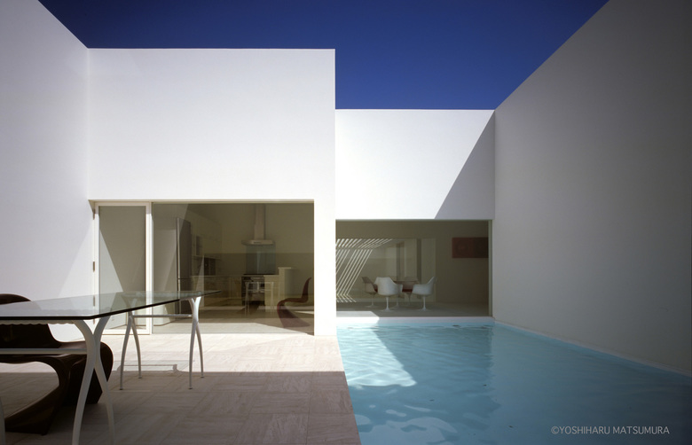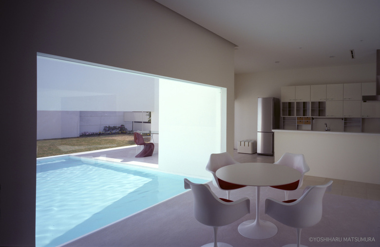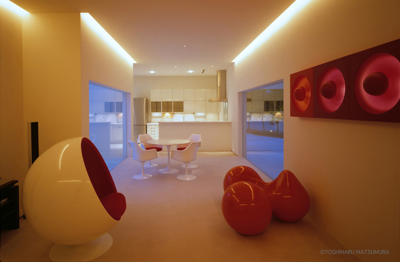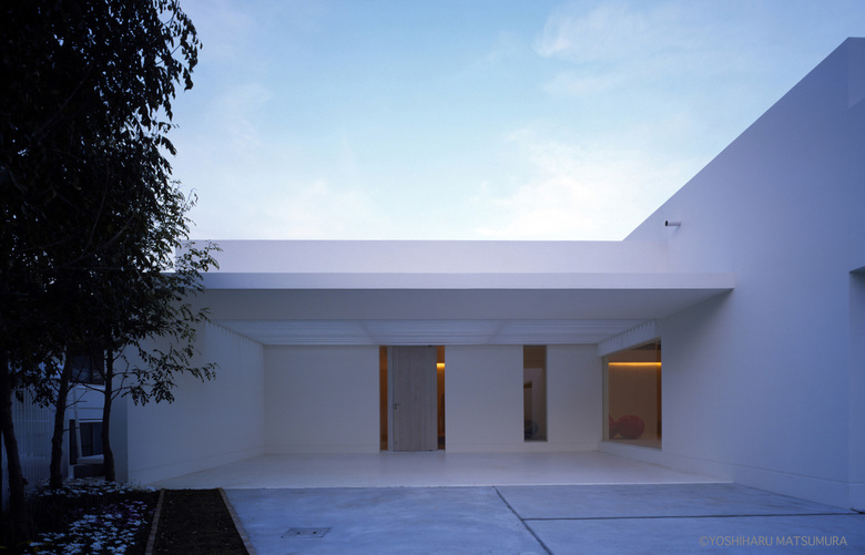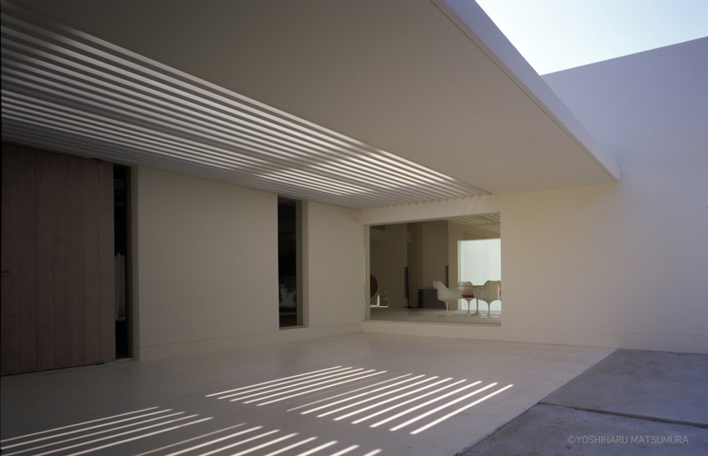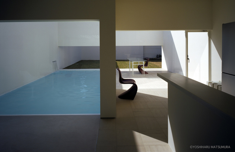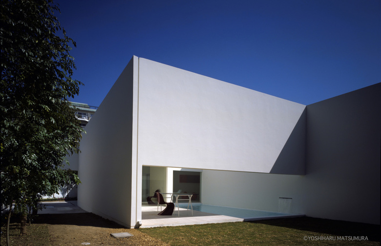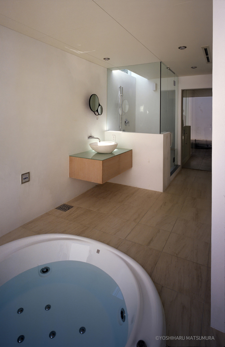 A site is located in Higashinada-ku, Kobe-shi Uozaki, and Sumiyoshi river is flowing around frontal road. This whole is maintained gradually after an earthquake, and a bank isestablished by either side on a river at present, and it's a walking of a dog and a jogging course and is the very good environment. The site shape is the shape that I transformed a little, and a site touches an esplanade in a riverside at slender scope of 4.5m, and I'm entering a wide site through there. A building is arranged in left and right focusing on the axis inevitably also the outward appearance is that it consisted of a wall centering on a basin because it's circled in housing and an apartment four rounds, and all walls will be a campus of light and the shadow, and it's possible to enjoy the change a season changes and by which it's a day because the slender street becomes vertical to Sumiyoshi river which passes in north and south with the axis which develops. A circled basin lights up in the building brightly by reflection of light in a building, and a shake is brought to the ceiling and a wall, and you give me a change. When it'll be the time of the evening, indirect light is changing an expression in a building gradually. Spatial structure conscious of a minimum is a design base in the outward appearance and furnishing to enjoy harmonious space by such nature.