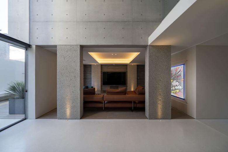To realise the concrete mass born of the owner's strong request, and to imbue the diagonal cut shape following the northern slope line with meaning,the facade was conceived by combining three-dimensional forms, as if sculpting concrete itself. The resulting form comprises a surface inclined 7 degrees towards the road, vertical north-south planes, and two triangles connecting them. This sculpture, evoking a sense of wonder and sanctity, sits as if guarding the avenue lined with Chinese hackberry trees. The staircase first encountered at the entrance draws inspiration from the master architect Carlos Calpa. It represents a challenge to create complex three-dimensional forms in concrete, finished by grinding limestone mortar to aim for the staircase itself becoming an art piece.Upon ascending to the first floor, a simple, symmetrical plan unfolds, centred around four columns formed with a concrete bush hammer finish. Flanking these are the living and dining areas. A single path runs straight through the centre, piercing to the exterior, where a two-storey-high opening with an inverted cross-shaped frame, symbolically unifying the entire structure.