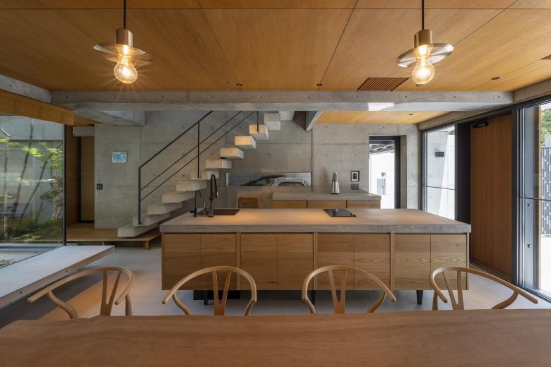 The design creates a fundamentally visible yet private environment by establishing a frontage facing the road as a lush open space incorporating parking and an approach.The exterior walls are finished entirely in exposed concrete, while the roof is gabled, spanning over H-beam girders. This combination of concrete and H-beam creates a dynamic impression.