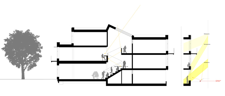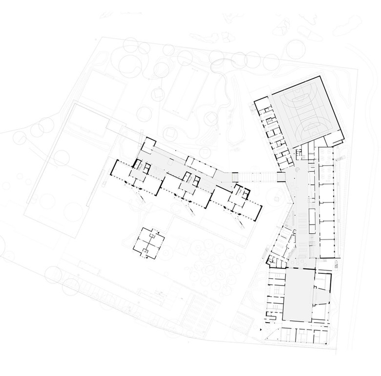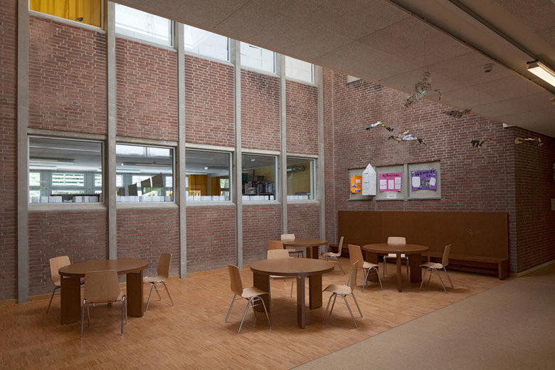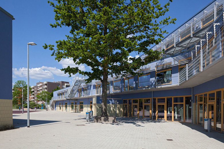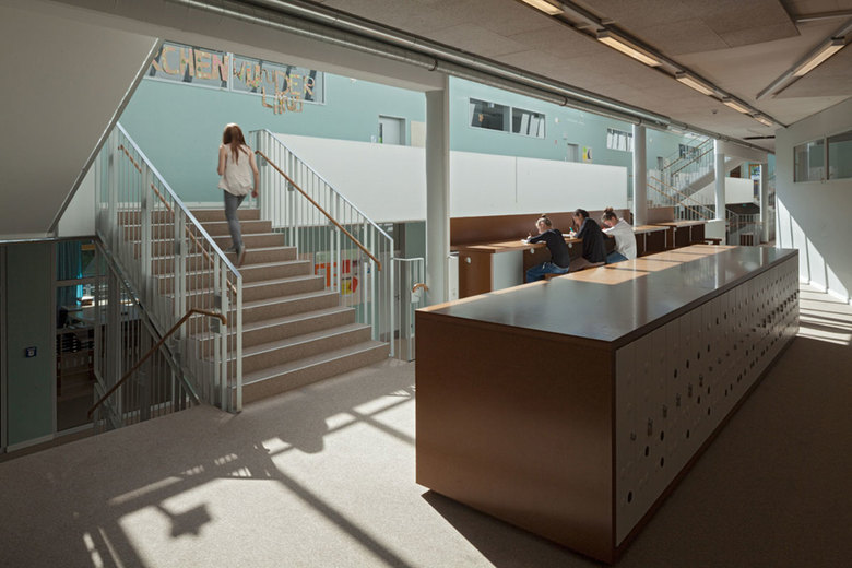 Eine Wegeverbindung führt direkt über die Schulhöfe in die nahe gelegene Wohnsiedlung. Das Anliegen der Schulleitung, ein niedrigschwelliges Angebot an alle Bewohner des Stadtteils anzubieten wird durch eine grosszügig verglaste und offen gehaltene Erdgeschosszone unterstützt.