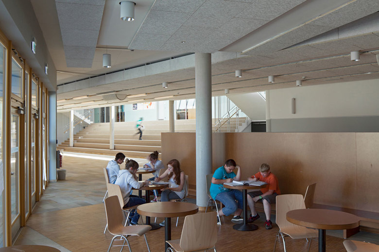 Das Zentrum und Herz der Schule(n) ist ein großer sich über mehrere Geschosse entwickelnder offener Innenraum. Alle Treppenaufgänge sind offen und frei angeordnet ohne weitere störende Türen und Brandschutzabtrennungen. Im Erdgeschoss befinden sich die Pausenhalle, die Bibliothek, Cafeteria, Fachklassenräume, alles Räume die nach Schulschluss dem Stadteil zur Verfügung stehen. Im den beiden Obergeschossen erweitert sich der zentrale Innenraum in eine offen konziperte Lernlandschaft. Diese konnten durch speziell angefertigte Möbel auch so gestaltet werden, das ein ausgewogenes Verhältnis von Offenheit und Transparenz und Intimität sowie konzentrierter Arbeitsatmosphare entsteht.