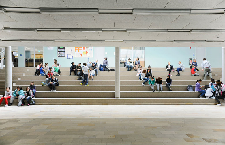 Bestandsgebäude mussten erhalten werden und konnten ohne Bruch in die Gesamtkonzeption miteinbezogen werden. Die erst vor ein paar Jahren erstellte Aula wurde in die zentrale Halle eingebunden.