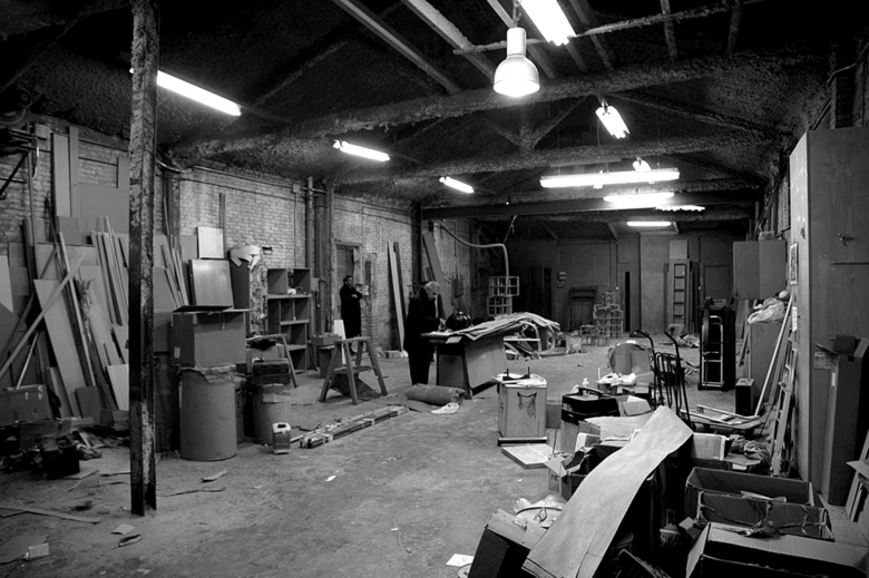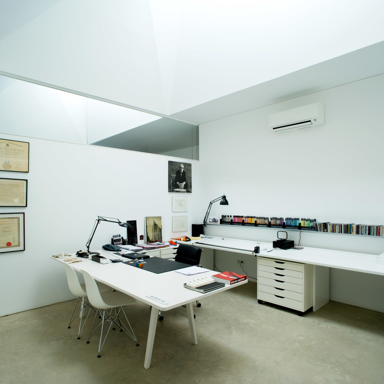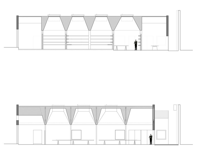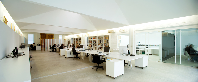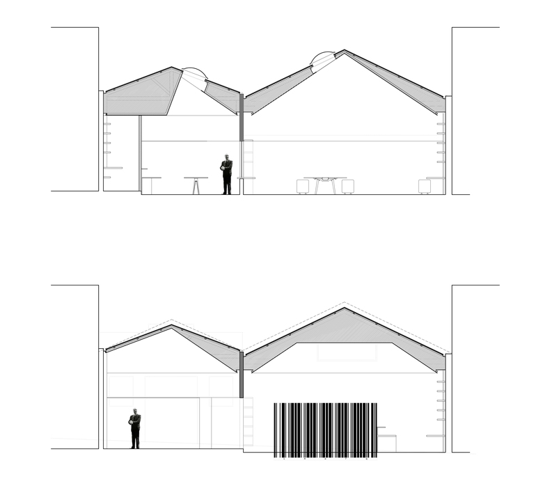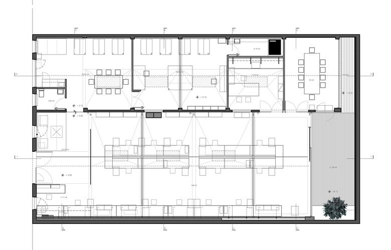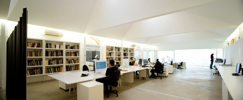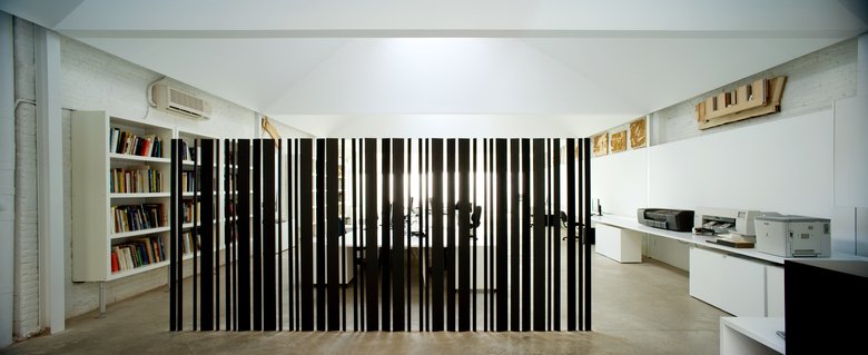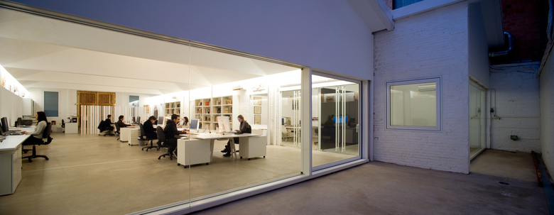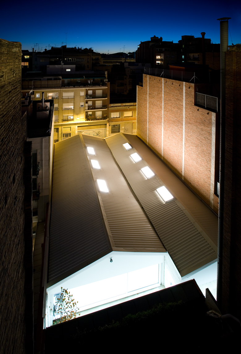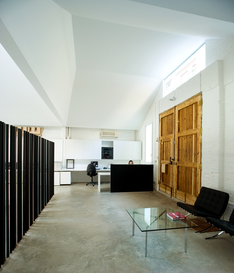 In spite of its ruinous interior, this former carpenter’s workshop had great potential for conversion to an architectural office. The biggest challenge was how to introduce natural light into the two diaphanous spaces, each of which were covered by a pitched roof, typical of 19thcentury industrial design in Barcelona. The question was resolved by the design of a new ceiling incorporating skylights and supported by the crossbeams, which unfold across the two spaces almost like a big tent. A small courtyard was created at the rear, with the glazed facade providing additional natural light. The original facade and massive wooden door have been preserved “as is” enhancing the spatial experience of entry into the light-filled interior where a metal sheet ‘barcode’ establishes the reception area and partially conceals the work area, which is organized along continuous tables in the middle. The smaller volume was organized into sequential subdivisions containing the bathroom, kitchen, and model workshop.