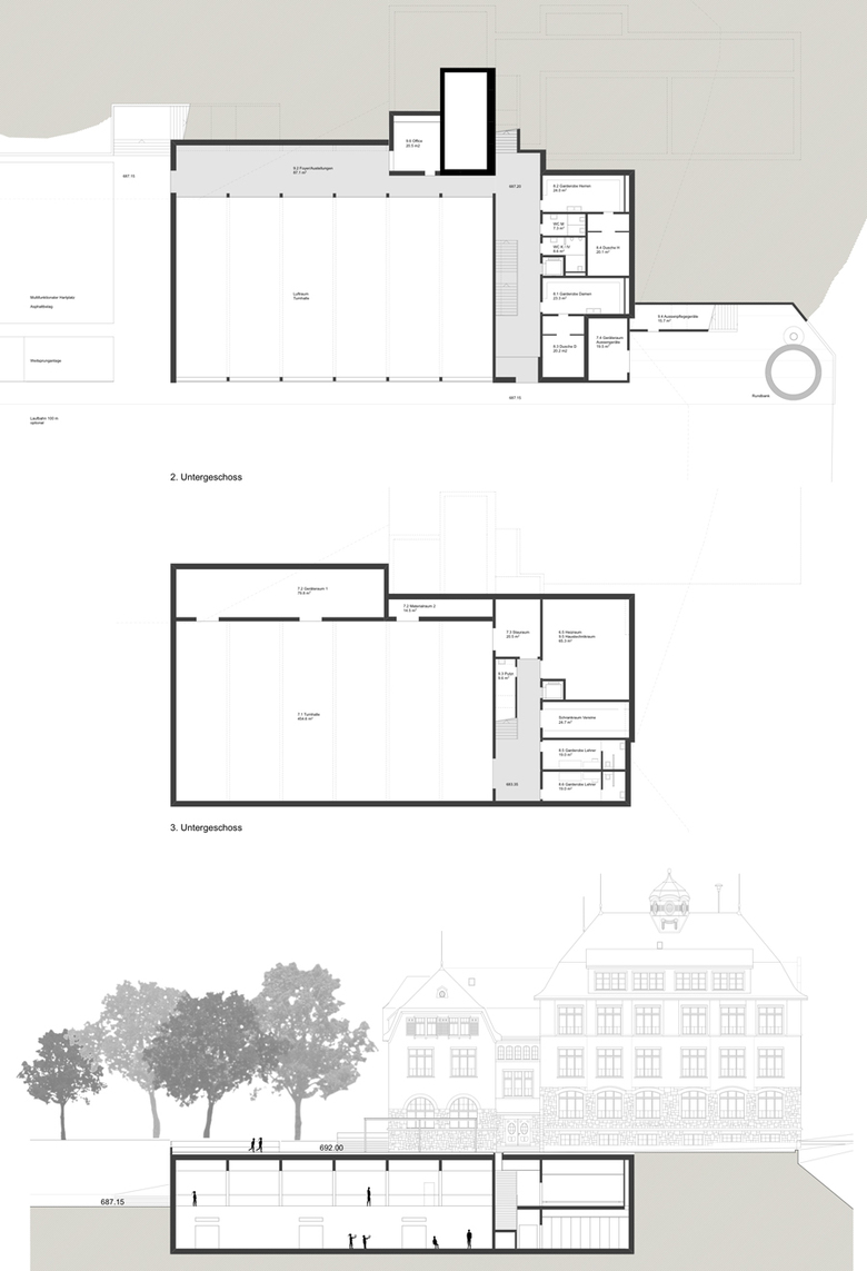 Die neue Turnhalle ist kein Gebäude im klassischen Sinne sondern wird als Teil der topografischen Staffelung interpretiert. Das unterirdische Gebäudes ist nicht nur Fassade, sondern zugleich auch Stützmauer. Die bestehende Erschliessungszone wird mit einer Kaskadentreppe ins Untergeschoss weitergeführt. Der seitliche Zugang für den Vereinsbetrieb erweitert sich in eine grosszügige Foyerzone und ist ein Pendant zum Erschliessungsgang der Klassenzimmer. Die Statik der Turnhalle ist eine gerichtete Tragrippenstruktur und entspricht in ihrer Einfachheit wie auch ihrem Gefüge dem Ordnungsprinzip des Schulhauses.