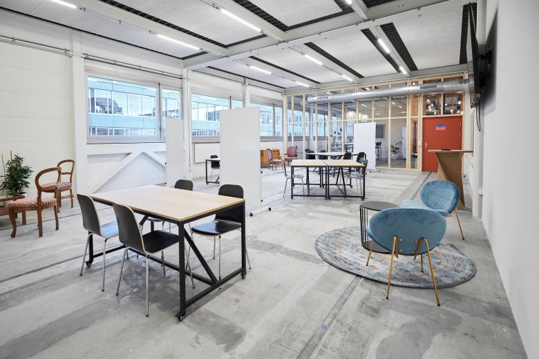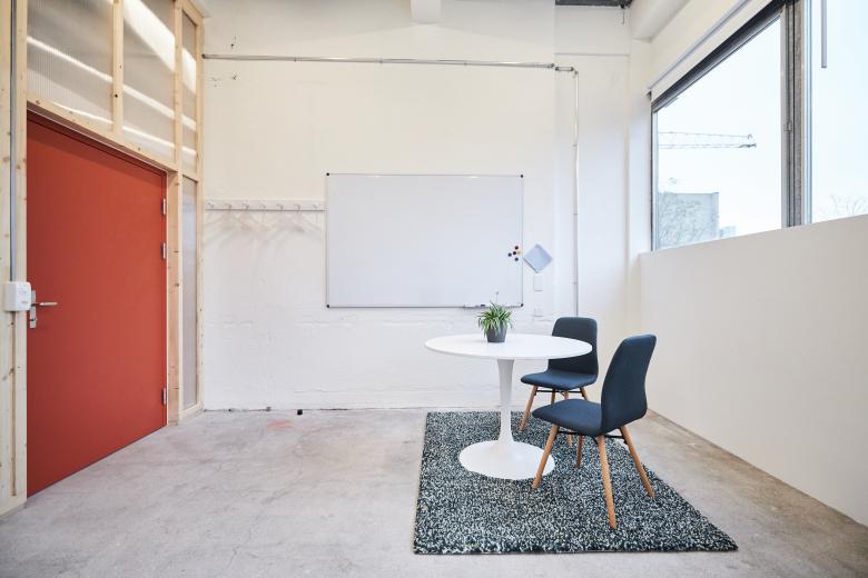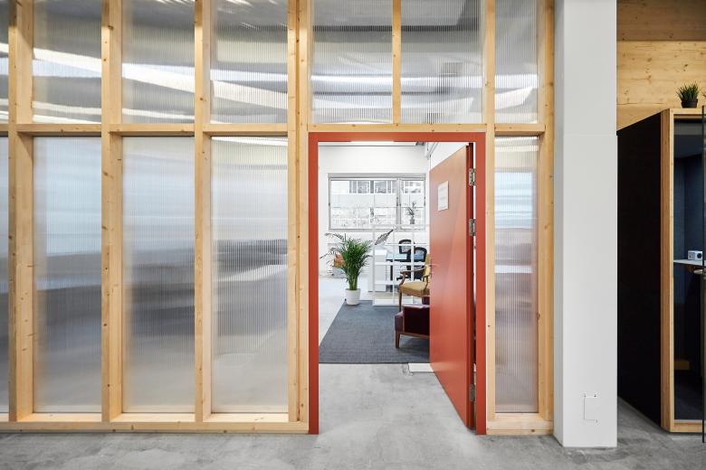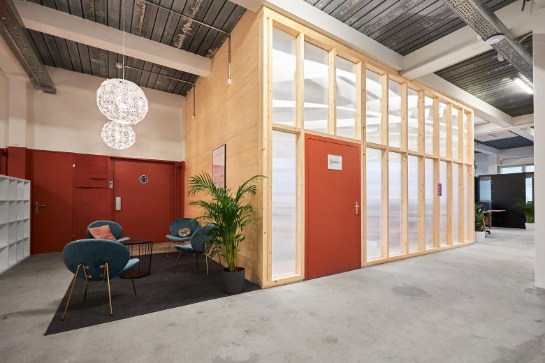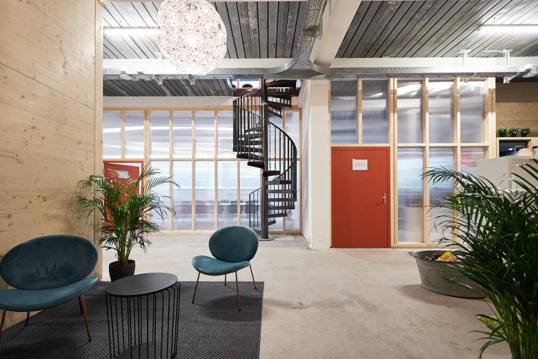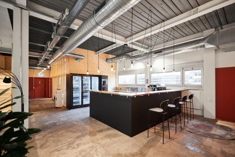 Aus ökologischen wie auch ökonomischen Überlegungen prägen leichte Ausbauten mit möglichst roh belassenen Materialien den Ausbau. Zusammen mit den Charme der verblassten industriellen Nutzung wurde eine ungezwungenen Atmosphäre für einen zeitgemässen Coworking-Space geschaffen.