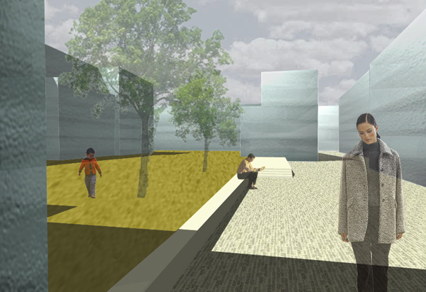Das gesamte Areal ist frei von Durchgangsstrassen. Das Innere bleibt den Fussgängern und Fahrrädern vorbehalten. Die Erschliessungen sind als Raumfolgen und Raumepisoden mit wechselnder Charakteristik formuliert. Die Strassenräume sind Aufenthalts- und Erlebnisräume und werden dem entsprechend gestaltet. Sie dehnen sich immer von Fassade zu Fassade aus.