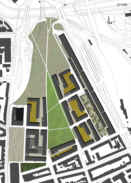 Im Zentrum liegt der grosse Park. Er wird dreiseitig von Bauten eingefasst. Seine Ränder brechen die Orthogonalität der angrenzenden Baufelder.
