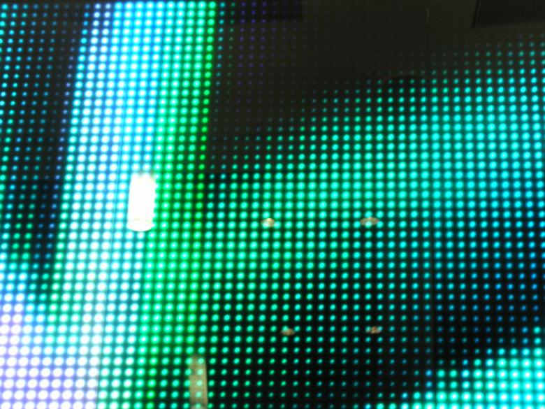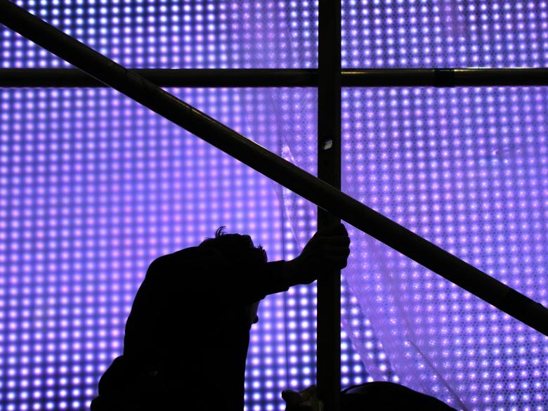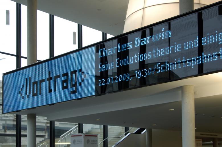 LED display, two considerations were important. On the one hand, it should belong to the architecture, and not be a technoid wall decoration. To make the display an integral part of the building, we placed it at the position of the parapet of the spatially recessed upper floor. On the other hand, we did not want an intrusive media façade, which overloaded public space with images and signs – no Times Square in Darmstadt. The display is thus not mounted outside on the façade, but belongs to the interior. The informational text that runs on it is quite strict in terms of typography and design – there is only one font.