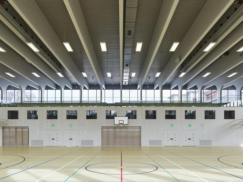 Verdichtung zum Haupteingang des Eggschulhauses und gibt gleichzeitig grösstmögliche Durchblicke zur parkartigen Oberstufenanlage frei. Das Foyer bietet festlichen Anlässen einen adäquaten Rahmen und mit den Brettschichtholz-Trägern und dem durchlaufenden Fensterband vermittelt die Sporthalle ein Bild von eleganter Einfachheit.