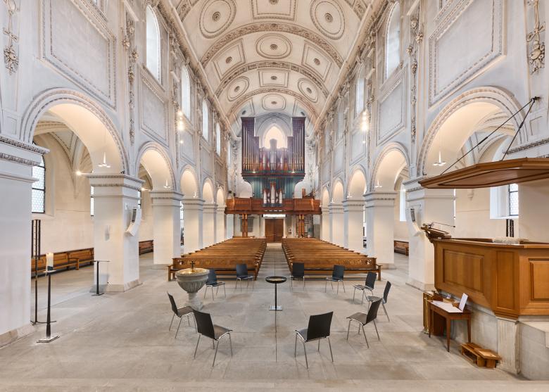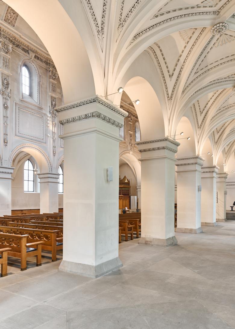 Dreiköpfige Pendelleuchten ziehen sich im Rhythmus der Stützen jeweils seitlich im Hauptschiff nach vorne und gruppieren sich beim Chor in einer flächigen Anordnung. In einem Ring eingefasste Glaslinsen, die nach oben und unten das Licht abstrahlen, generieren ein zurückhaltendes Grundlicht und gleichzeitig betonen sie die Bögen zwischen Hauptschiff und Seitenschiff, sowie die Kirchendecke. Das Projekt umfasste den Ersatz dieser bestehenden Beleuchtung, um nebst einer energieeffizienten Beleuchtung auch weitere steuertechnische Möglichkeiten zu erlangen, wie beispielsweise die separate Ansteuerung des Direkt- und Indirektlichtes. Mit den zusätzlich installierten Strahlern, die den bisher zu dunklen Redner- und Chorbereich nun in geeigneter Helligkeit präsentieren, werden zusammen mit der gesamten Beleuchtung deutlich mehr Lichtszenen für unterschiedlichste Nutzungen möglich.