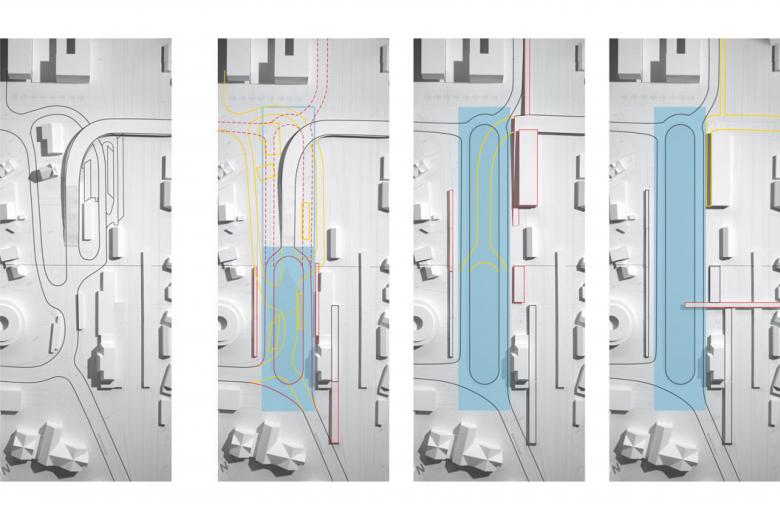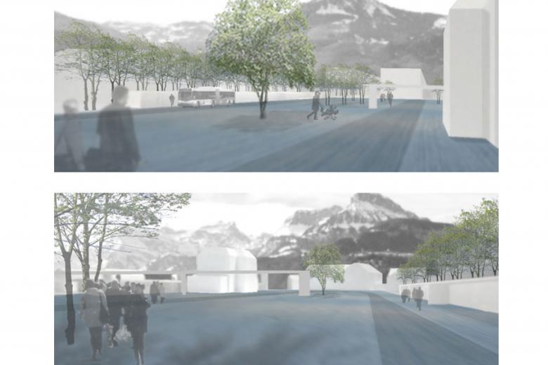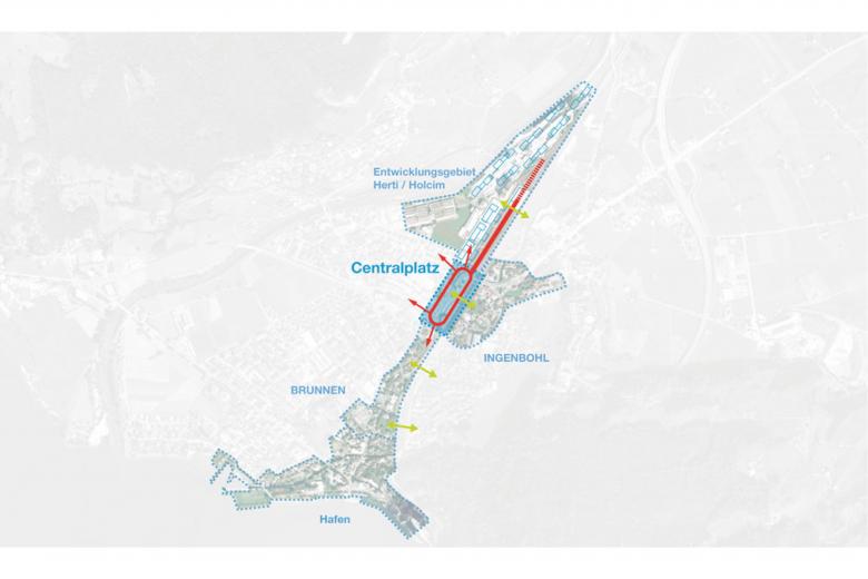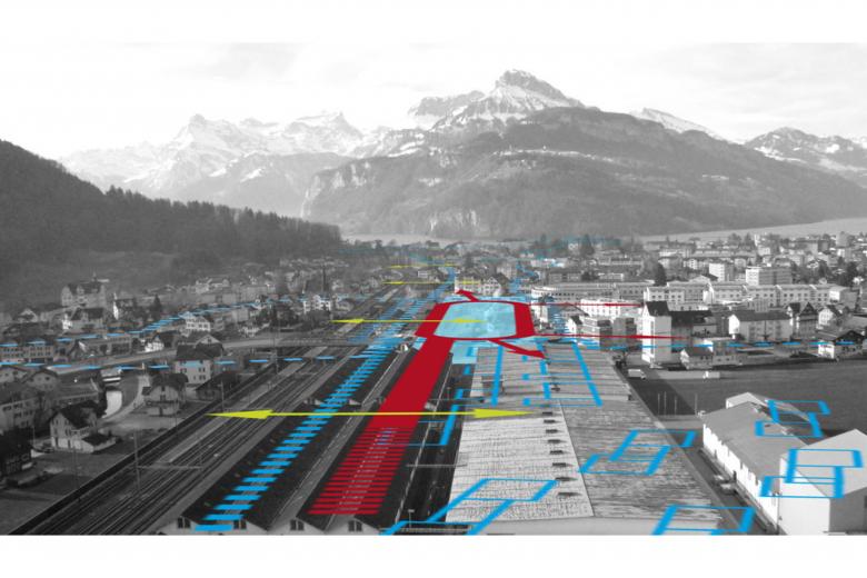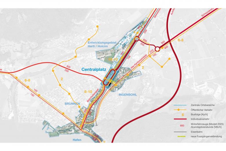 Der Bahnhofplatz Brunnen präsentiert sich als planlos gewachsenes, heterogenes räumliches Konglomerat. Der Ankommende kann sich schlecht orientieren, die Strassenführung ist für die ehemaligen industriellen Nutzungen optimiert, zudem dominiert das teilweise sehr hohe Verkehrsaufkommen die Stimmung dieses Ankunftsortes. Durch den Zusammenschluss der Gemeinden Ingenbohl und Brunnen, die geplanten Veränderungen auf den Industriearealen Herti/Holcim und die in der Richtplanergänzung Rigi-Mythen vorgesehene neue Verkehrsführung entsteht die Chance, eine innere Aufwertung vorzubereiten. Dafür wurde eine Konzeption gesucht, die den Bahnhofplatz als verbindendes, zentrales Element versteht und ihm eine adäquate Erscheinung verleiht. Innerhalb eines interdisziplinären Planungsteams (Verkehrsplaner, Architekten, Landschaftsarchitekten) wurde nach Strategien gesucht, die in einer schrittweisen Veränderung den Platz räumlich und verkehrstechnisch optimieren können. Die heutigen Verhältnisse wurden kritisch analysiert. Nach Variantenstudien wurde der „ideale Zustand“ des Bahnhofplatz als grosser, ovaler Kreisel entwickelt. Im Entwicklungsszenario wurden die Ausbauphasen und die für die Umsetzung benötigten Elemente auf einer Zeitachse abgebildet. Die aufgezeigten Lösungsansätze sind bewusst konzeptionell gehalten. Sie schlagen eine starke räumliche und verkehrstechnische Struktur vor, welche die bereits absehbaren zukünftigen Anforderungen aufnehmen kann. Gleichzeitig ist sie so flexibel, dass sie auch noch unbekannte Veränderungen integrieren kann, ohne an Grosszügigkeit zu verlieren.