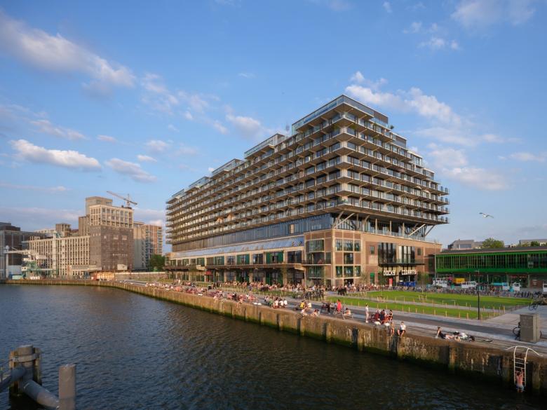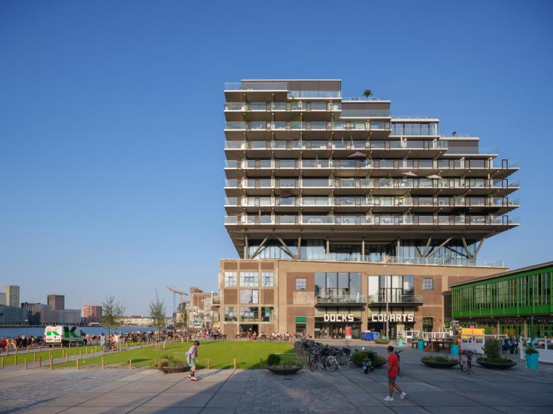 The facade of the volume consists of industrial frames with glazed panels set between them. The repetition of these so-called ‘muse frames’ creates an industrial look with a dockland character. The interior of the volume, by contrast, is an oasis of plants and warm materials that extends across the interior deck and connects with the loft apartments.