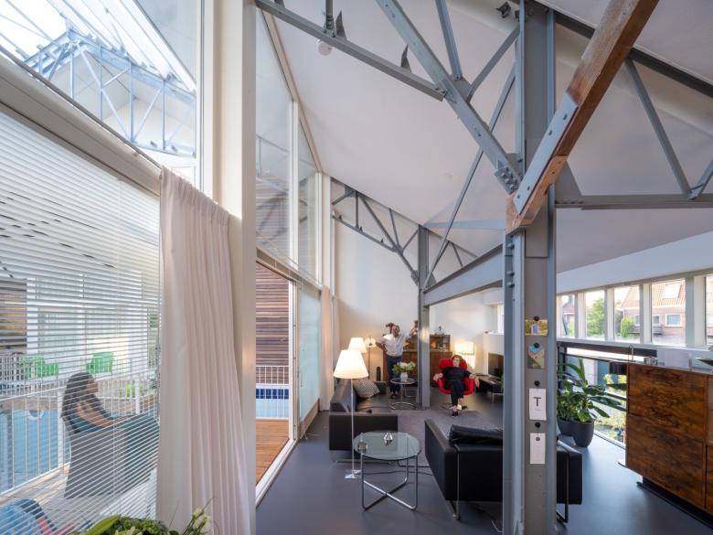 The loft houses in the Spaardersbad are all different due to their location around the pool. Except for two, the houses are accessed via wooden stairs and bridges that run above the swimming pool at the level of the first floor. All living areas are located on this floor. The high ceilings, which reach up to more than five meters, give the living space genuine loft quality. Moreover, the restored steel construction contributes to the atmosphere of living in a loft. The high transparent interior facades around the courtyard provide ample daylight in the homes. The sleeping areas are on the ground floor, adjacent to the garden and bottom of the pool. In the original tiled walls of the pool, small round window openings have been made to connect with the inner garden in the pool. All houses have a private veranda adjacent to the green inner garden and a private garden at ground level on the outer facade.