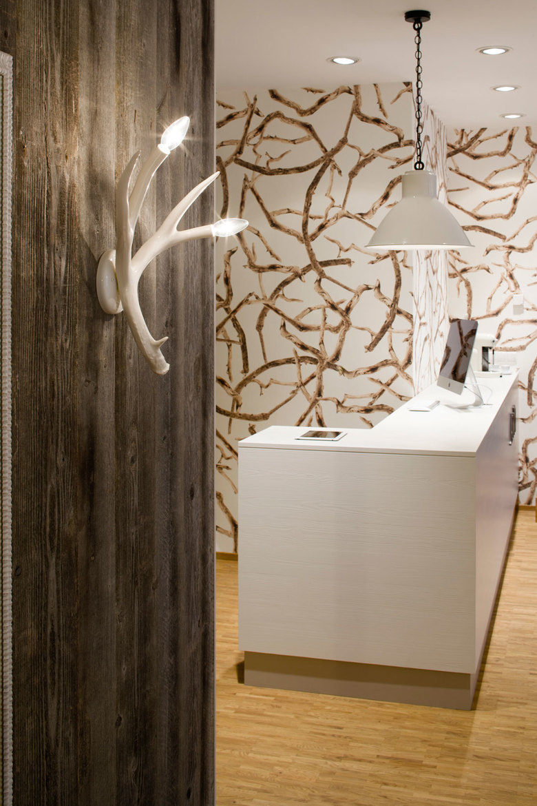 So a fashion shop was created, which combines those things: an old wooden table from Holland, designer wallpapers from Italy, deer antler lamps from the USA, and fine carpenter work from Bavaria.