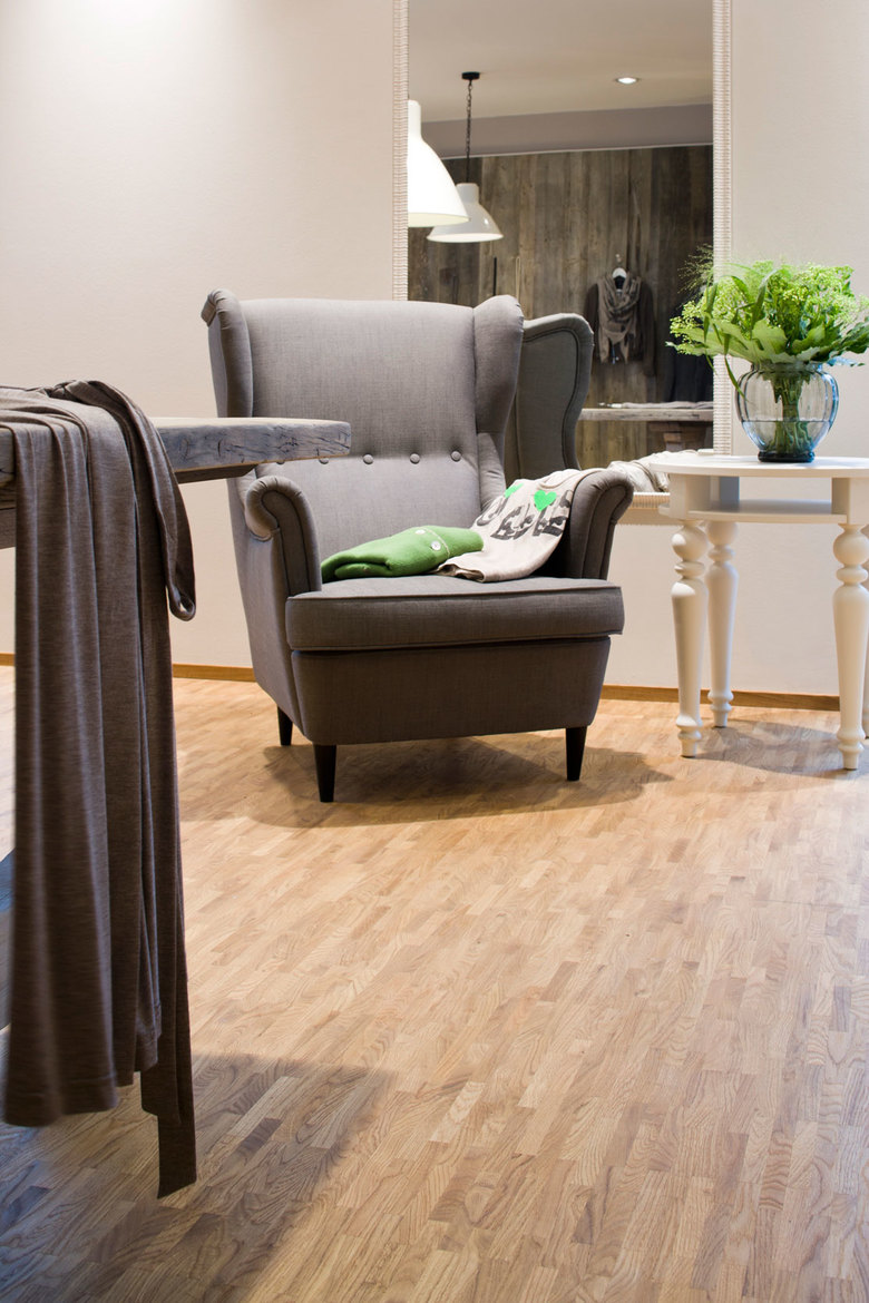 Solid oak floors and discreet gray color schemes of the wood waste connect everything into an inviting shop.