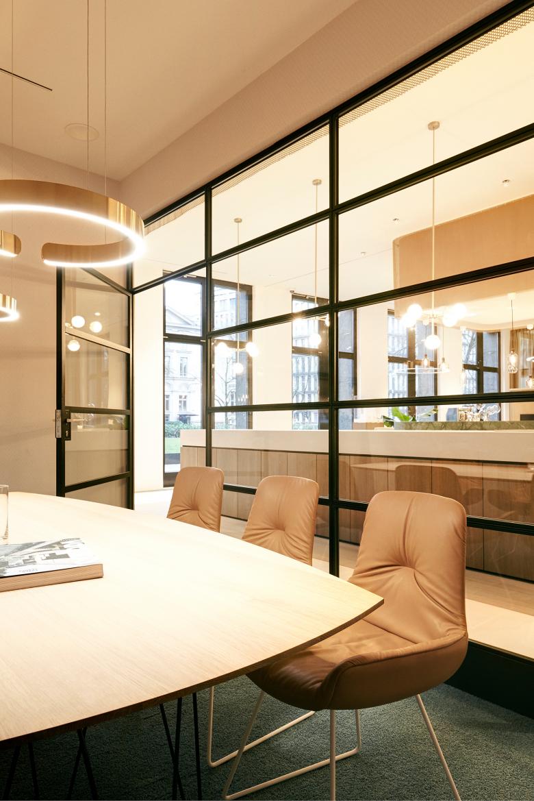 Der Showroom ist in eine Farb- und Materialwelt von weiß über messingfarben bis hin zu dschungelgrün getaucht. So werden die Besucher an der zentralen Cafébar aus dem grünen Marmor „Verde Guatemala“ empfangen. Der Metallvorhang aus Messingspiralen läuft die Decke entlang und erinnert an einem goldenen Horizont, dessen warme Lichtreflexion die Wohlfühlatmosphäre im gesamten Showroom prägt. Die einladende Weite der Fläche unterstreicht der weiße Estrichboden. Als Farbakzent blitzt immer wieder frisches Türkis auf. Als Teppich oder Sitzkissen macht es die Musik zwischen den warmen Farben und satten Oberflächen. Die Sitzgruppe mit den gemütlichen Sesseln gleich am Eingang erinnert an eine Kaminsituation. Hinter den raumhohen Glasscheiben aus getöntem Glas liegt luftigangeschlossen ein großer Konferenztisch und an anderer Stelle eine kleine Ecklounge. Hinter der gesprossten Glastrennwand wurde ein akustisch getrennter Konferenzbereich eingebaut,der Diskretion garantiert. Die lange Bench aus Echtholz präsentiert die Produktauswahl der verbauten Materialien und Oberflächen.