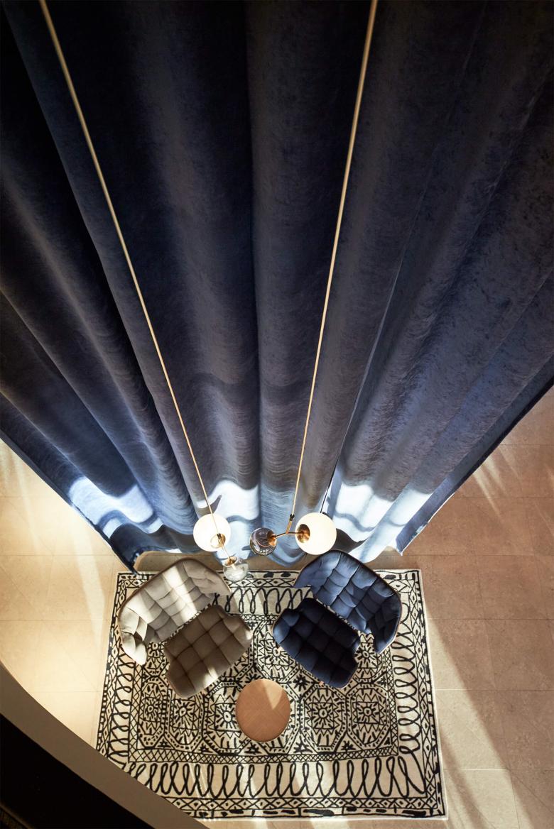 Der erste Eindruck zählt: Beim Betreten der Lobby öffnet sich ein 6m langer, dunkelblauer Samtvorhang und gibt den Ausblick frei auf das Golf-Green der Hotelanlage. Davor empfangen Chaiselonguen die Gäste, dahinter gruppieren sich Sessel und Sofas um den offenen Kamin. Living Lobby, das Wohnzimmer des Hauses, wird zum Treffpunkt für Hotelgäste, Bar- und Restaurantbesucher. Das Einchecken findet an großen rustikalen Tischen mit komfortablen blauen Samtsesseln statt.