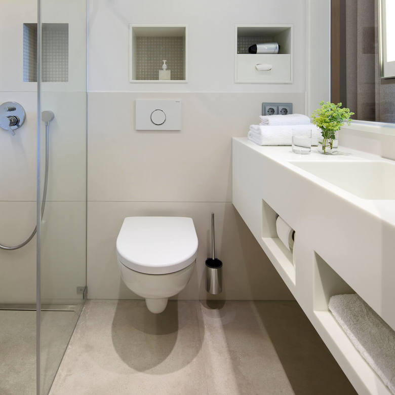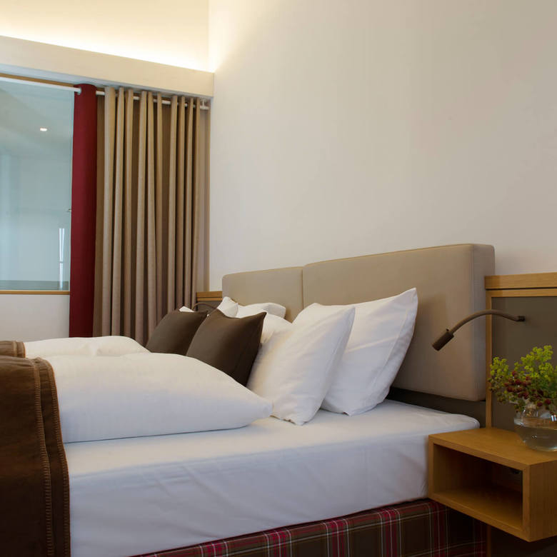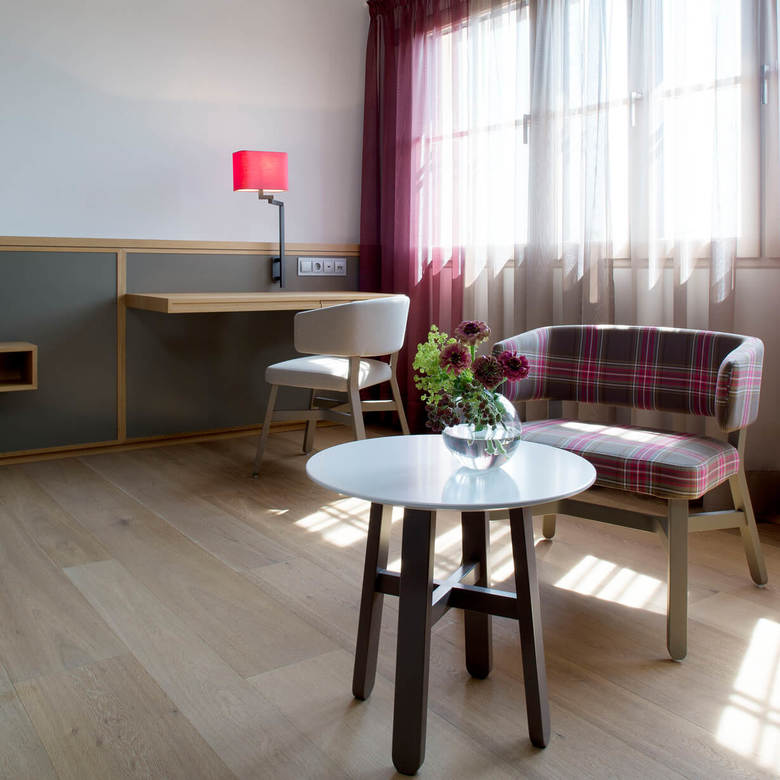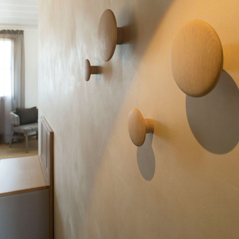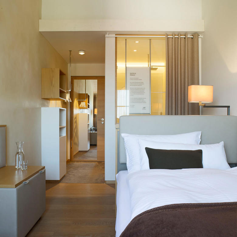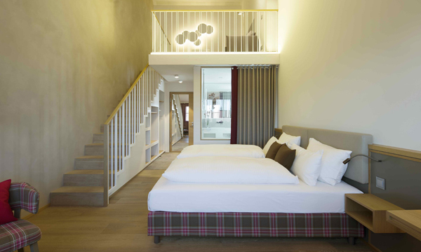 The expansion of the room is defined by natural materials such as oiled wood floors and clay walls. An integrated wall heating system produces comfortable radiant heat, known from tile stoves, which no longer produces any convection, making it allergy friendly. Air conditioning was conciously neglected, because the clay walls add to an excellent indoor temperature by taking in and releasing ambient air humidity and warmth. The bathrooms are openly affiliated with the bedrooms by glass screens and designed in modern style. Showers levelled with the floor and high-quality ceramic create an ideal addition to the cozy living and sleeping area. The new rooms invite you to relax and be comfortable.