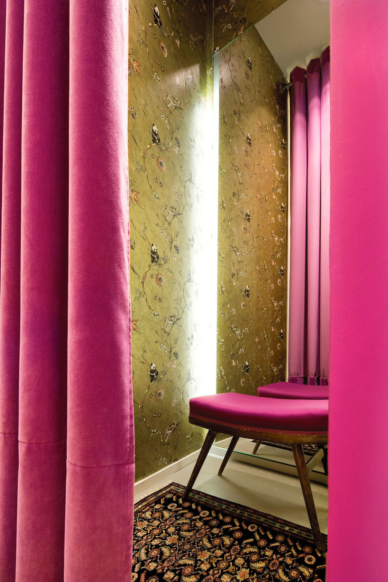 The strong pink of the buildings walls is accompanied by an elegant grey and a soft white. The connection to India is made through golden elements (such as the brand’s logo),tiger-patterned wallpapers and the paintings on the furniture.