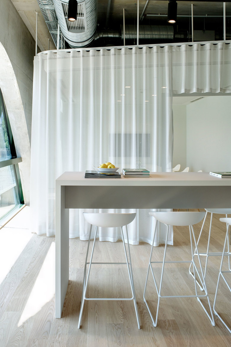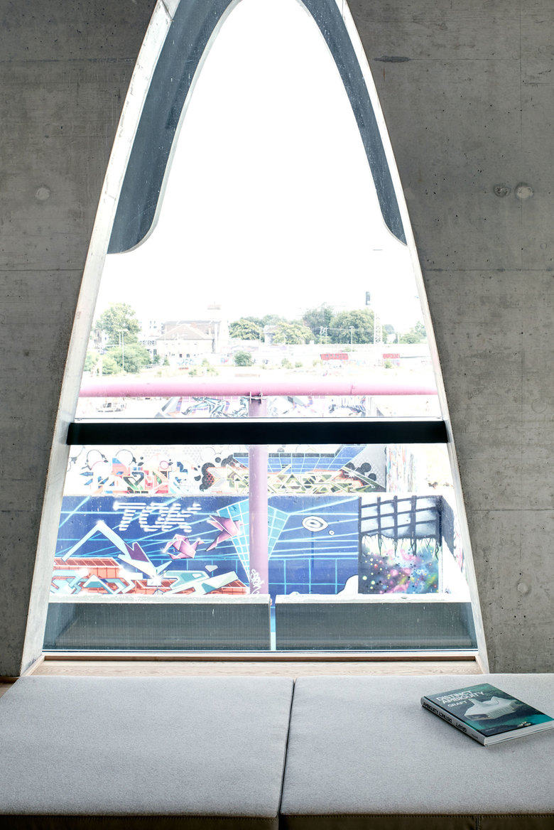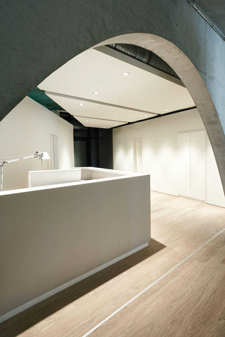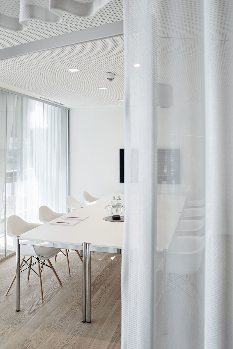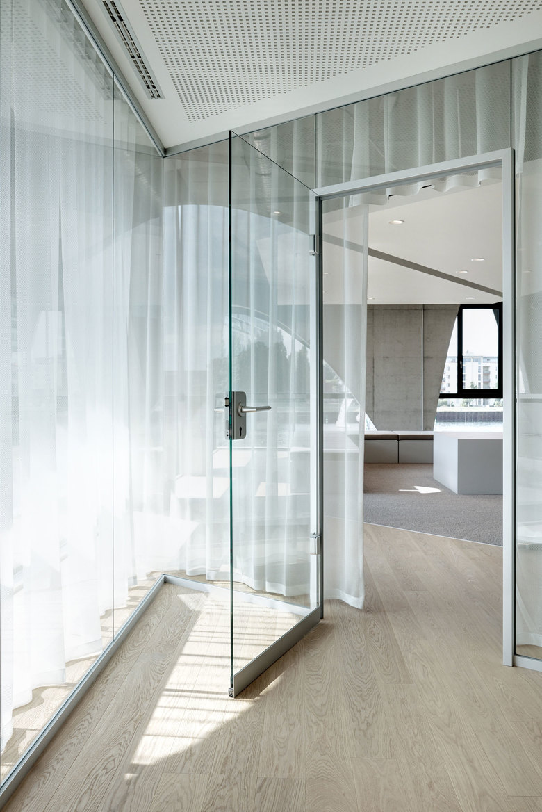 The polygonal rooms arrange themselves detached from the facade, divided by glass barriers with textile curtain elements. The rather harsh exposed concrete gains a cozy opposite with wooden flooring, carpeted areas and an individually adapted lighting.