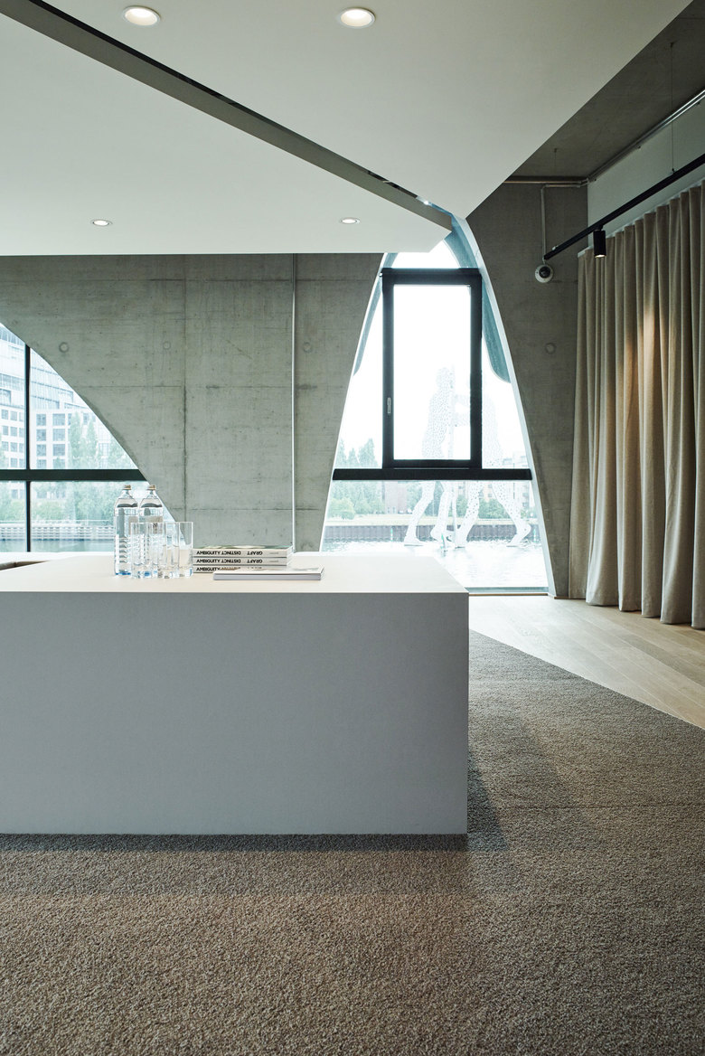 The project and the new showroom are right by the river Spree. The space defining front with its bent windows dominated the interior design. It was necessary to create a distinct world which neither competed with nor faded next to the existing construction.