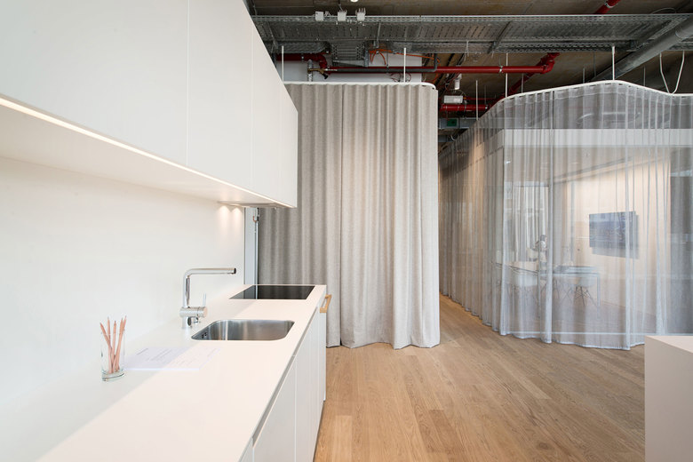 The showroom gained a décor which can later be found in the apartments as well: Oak floors, space division through curtains and a classy design kitchen.