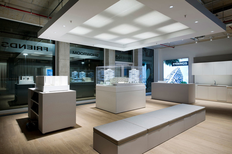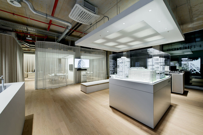 Showroom Friends sells apartments. The loft is located right by the quarter that is being built-up. This way, clients are able to observe the rising of their new estate with the title „Friends“.