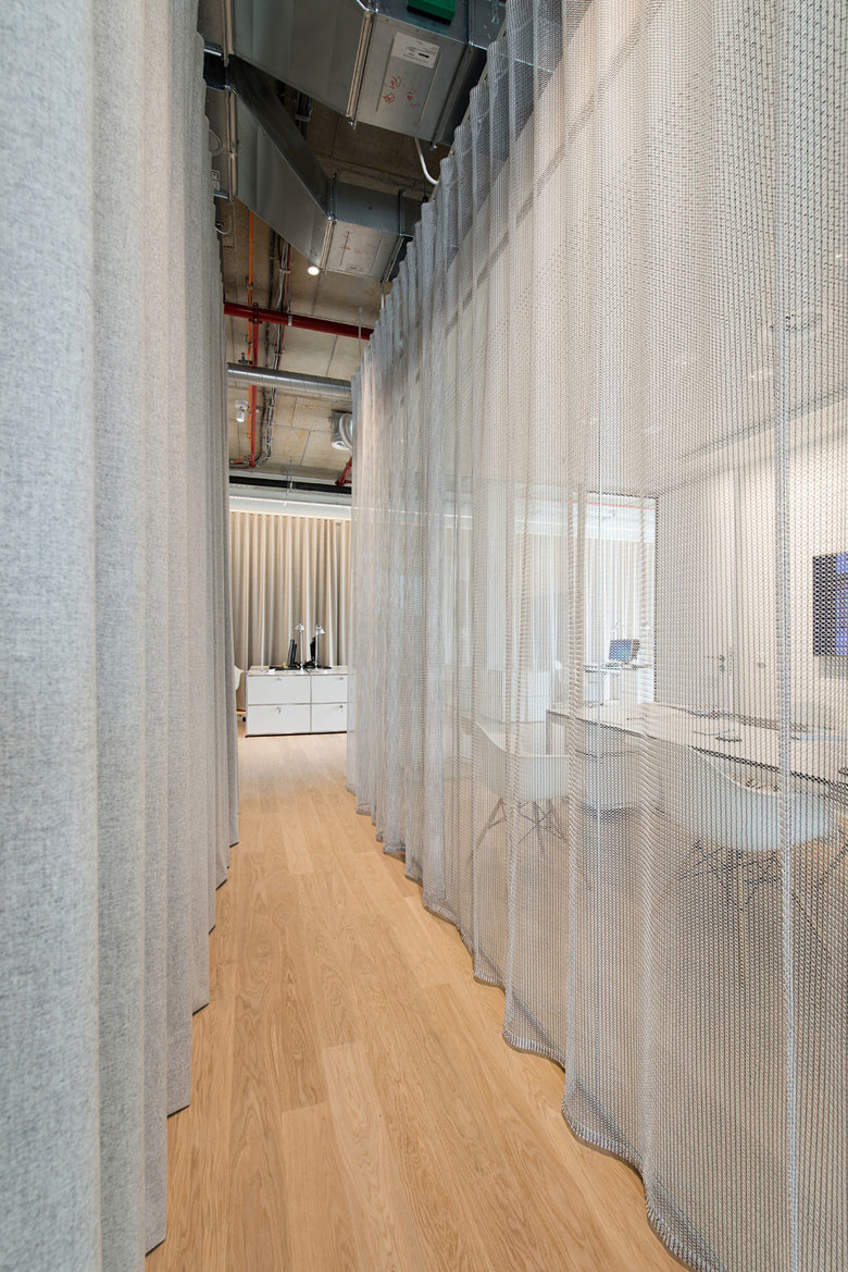 The broad textile zones with 3,20m height serve a homelike as well as an acoustic function.