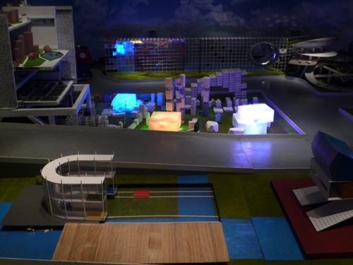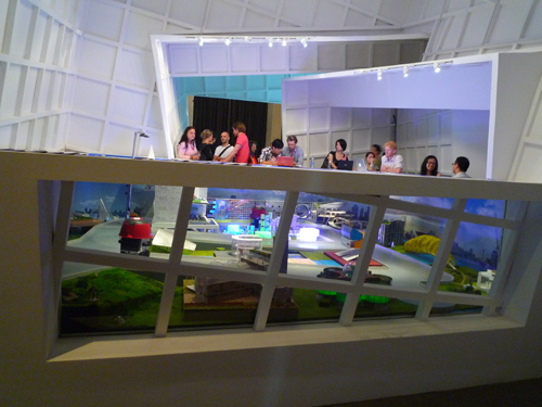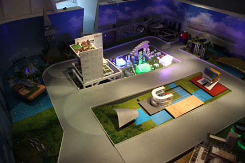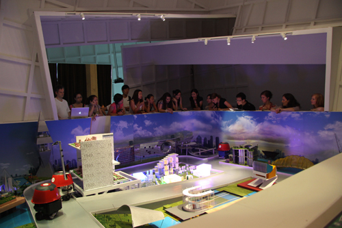 Video robots become a remote controlled “third eyes”. The video robots can be controlled online via Skype and at both exhibition locations. This way the audiences can explore the physical architecture model landscape of visions for the future virtual city remotely in the live exhibition in Shanghai, developed by students, artists and architects in two teams from Rotterdam and Shanghai.