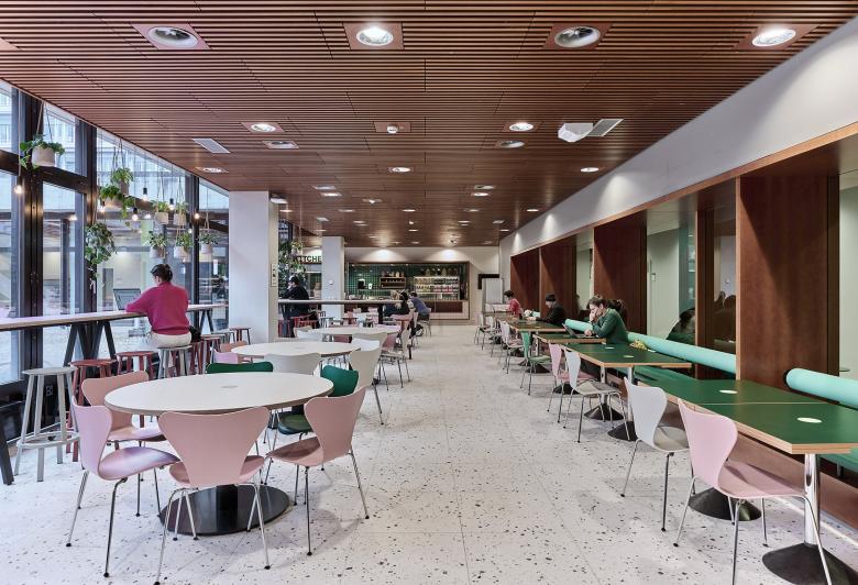 Den tausenden Studierenden auf dem Campus der Universität Zürich Irchel stehen für ihre tägliche Verpflegung eine Mensa sowie kleinere Cafeterien mit unterschiedlichen Konzepten zur Verfügung. Bereits 2019 hat Mint Architecture im Erdgeschoss der Hauptmensa die Cafeteria Seerose in ein modernes Gastrokonzept mit Selbstbedienungsrestaurant umgewandelt. Beim Umbau des ehemaligen Atriums lag der Fokus auf einer sorgfältigen räumlichen Gestaltung unter Berücksichtigung bestehender Strukturen.