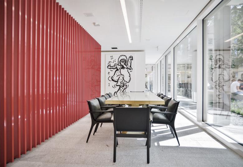 Das umgestaltete Foyer bildet den dritten Bereich. Hier wurde mit einem Empfangsdesk vom berühmten britischen Objektkünstler Liam Gillick die Begegnungszone «The Gallery» geschaffen. Sie ist Treffpunkt für Mitarbeitende, Wartebereich für Gäste, Meeting-Location und Kunstgalerie für Exponate aus der Sammlung Ringier. Diese Kunden- und Begegnungszone wird von Mint Architecture entworfen und zusammen mit dem Radiostudio und dem Gastrobereich zu einem architektonischen Ganzen zusammengeführt. Sich informieren, konsumieren, verweilen, sich treffen und geniessen: Dies alles ist im neuen Medienhaus möglich.