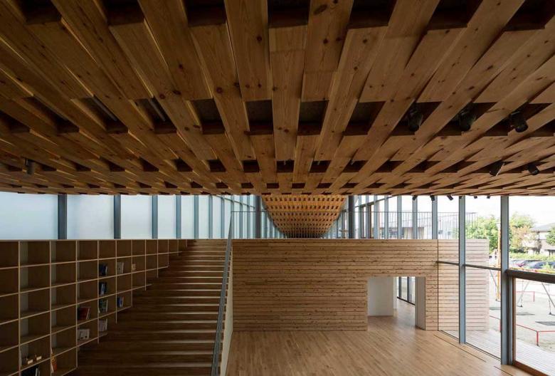 On the other hand, the existence of this architecture is realized by the shape of the catenary curve defined by gravity - the most fundamental element in natural science. The tender roof like a timber cloth, which is supported by two parallel steel Torii-gate-shaped frames, covers the whole space creating architecture for children gently. This timber fabric was weaved with warp of short laminated European Red Pine sticks (Length: 1500mm, Width: 105mm) and woof of two steel rods(φ22mm) perforating them. Only tension occurs within the structure due to the property of the catenary curve, so this gentle and soft wooden roof frame enables to cover a large-span (up to 20m) pillarless space.