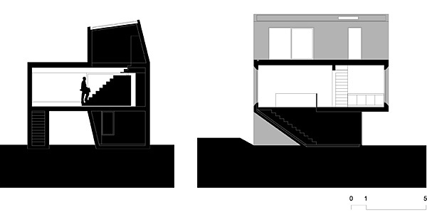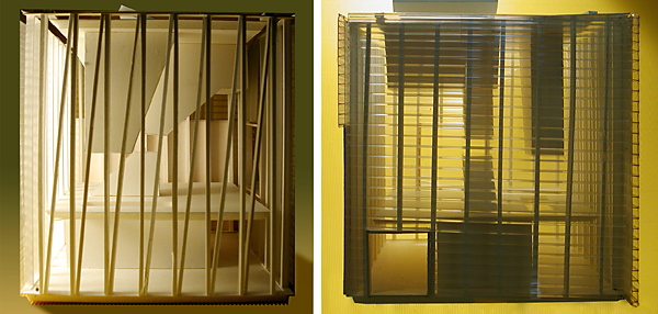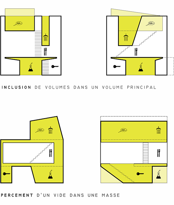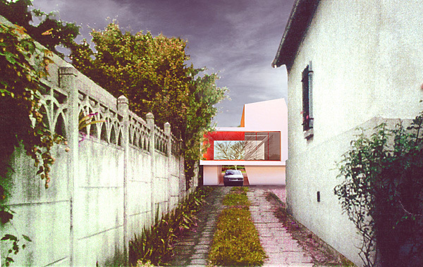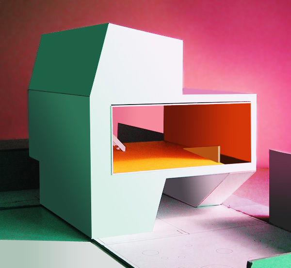 This project for a photographer’s house gave rise to two proposals illustrating the reversed versions of the same idea: that of the relationship between the principal central space and peripheral ancillary rooms. The first proposal was a 10-meter-high cubic volume with five translucent sides. The volume contained two «pockets» suspended from the roof and housing a bedroom and a shower room, while the third one at the ground level was occupied by the darkroom. The principal living area was formed by the empty space that surrounded those three opaque volumes placed within the cube. The initial project exceeded the allocated budget, therefore we sought to express the same idea by reversing the polarity and turning the structure inside out almost like a clothing item. The second project is designed more like a striking sculptural object placed in the heart of an area of suburban houses, its opaque components containing four main functional areas (entrance, darkroom, bedroom, bathroom) circumscribing the open living space, which runs through the middle of the structure and enjoys distant views of the urban landscape.