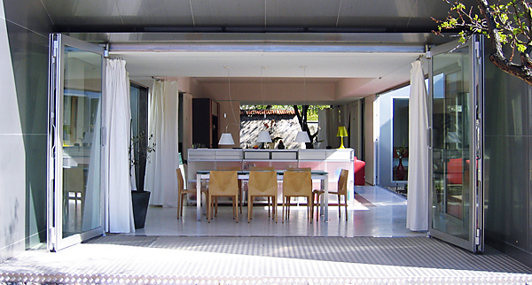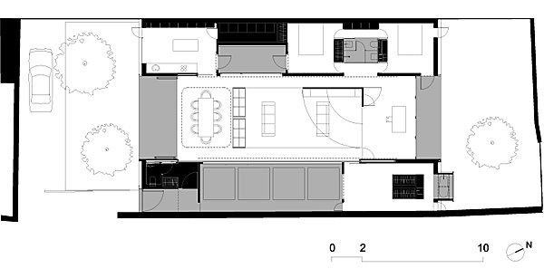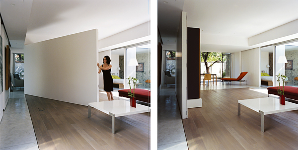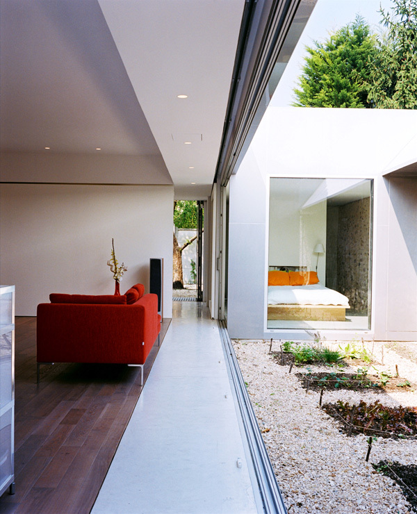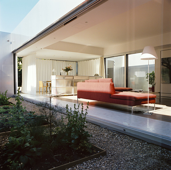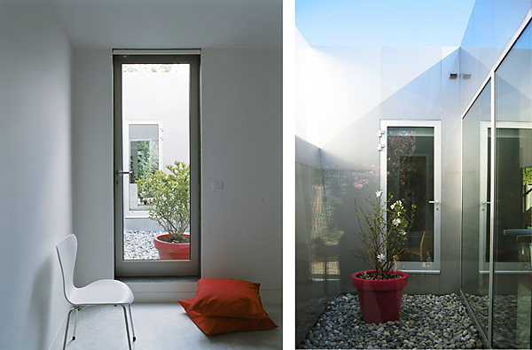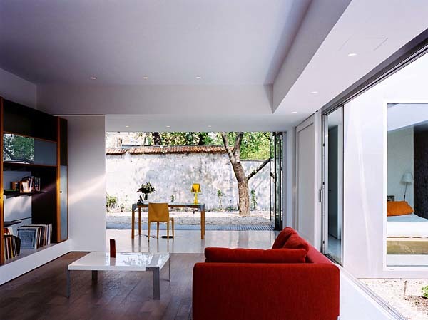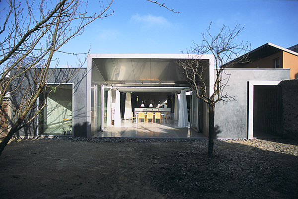 Situated in a market garden in the heart of a perimeter block, the plot stretches from north to south, along an old peach-growing wall – a green enclosure delimiting an isolated area of calm. Rather than a mere receptacle for a building, this orchard immediately struck us as an interior space that lent itself to dwelling. The house spreads out at ground level and blends into the garden, of which it occupies the entire width (and half the total surface). Invisible from the outside, with neither a façade nor a social status, this «non-house» is designed to be experienced from within. Mobile components (curtains, revolving and sliding partitions) make it possible to modify the outline and configuration of the main living area, while glazed panels fold away, opening up patios and terraces, and extending the domestic space into the garden. Box-shaped structures in glazed stainless steel reflect the light and facilitate the interior/exterior transition. The outline of the building blends into that of the orchard, and is only visible thanks to the horizontal plane of its roof. The result is a house that maintains direct contact with the sky and the surrounding nature.