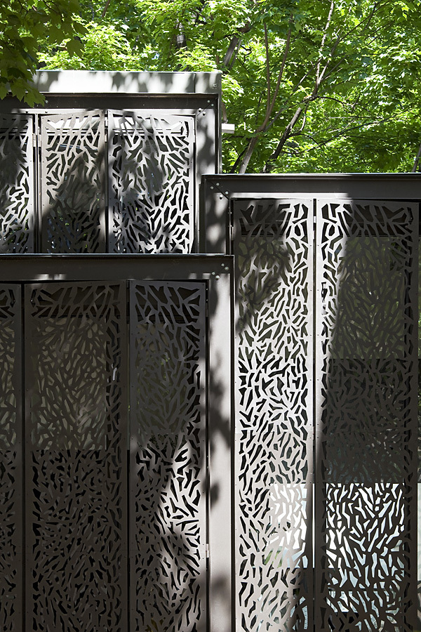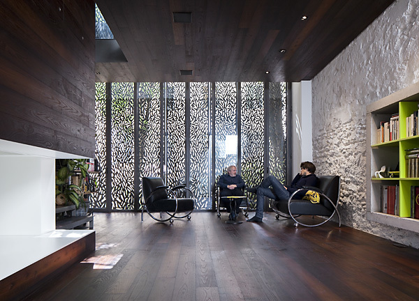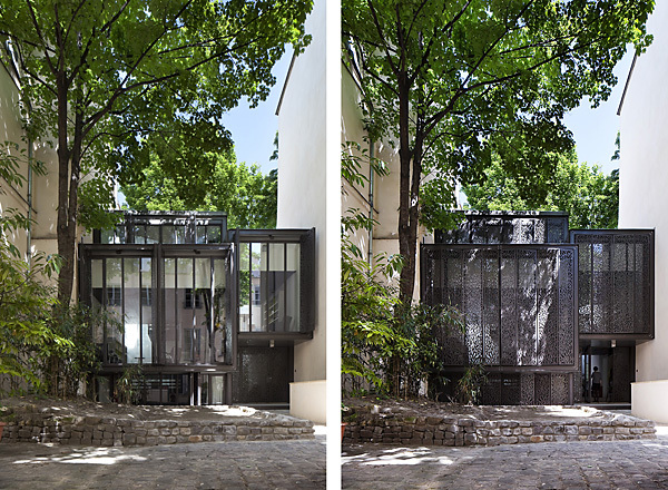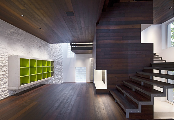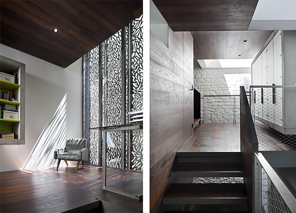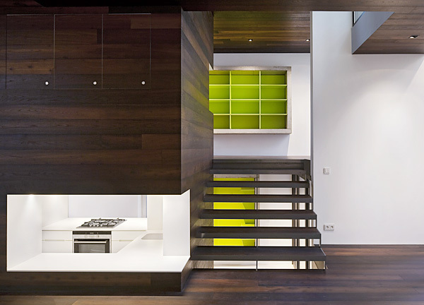 Built to replace a semi-abandoned house squeezed between two buildings in the heart of a very well preserved block in central Paris, our project is a tree-like structure delimited on three sides by existing walls. Only the fully glazed south façade gives away the almost total reconstruction of the building and provides a glimpse into the volumetric complexity of its inner space. An even better metaphor for the project would be that of a gigantic stairway. The entire residence is actually a staircase: its core contains the kitchen and wet rooms; its stairwell is shaped by the gables of the neighboring buildings, while its steps and landings form a sequence of living spaces. The client wanted a home with no partitions (except for the bathrooms), which made it possible to achieve total continuity from basement to roof terrace. The steel structure is an assembly of cantilevered floors borne by the central core and partly dissociated from the three outer walls onto which concrete boxes have been grafted to serve as built-in furniture. The choice of materials reinforces the design concept: the central core, floors and ceilings are uniformly clad in locust wood whose color and grain contrast with the texture and whiteness of perimetral masonry walls.