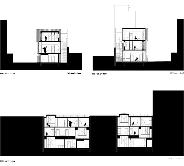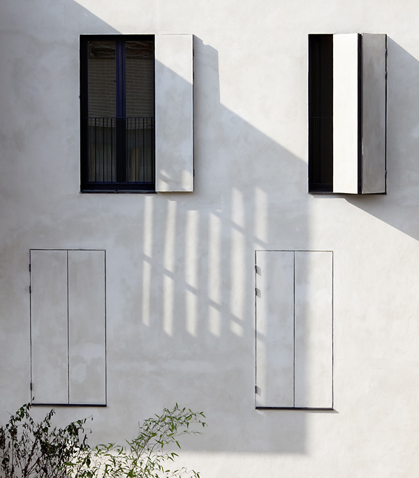 Perfect alignment with existing buildings and identical façade treatment ensure contextual integration of the project. The «commonplace» exterior is balanced by the singularity of living rooms. Each of the three buildings has one apartment per floor. The staggered arrangement of day and night zones allows for the difference in ceiling heights: 3,40 m for the living room versus 2,60 m for the bedroom. Blending the buildings’ outer envelopes with the surroundings erased the difference between the old and the new and provided a proper background for highlighting each individual residence with large bow windows that frame the increased height of the double-aspect living rooms. The principle equally applies to apartments and atéliers, emphasizing the fact that nowadays home and workspace tend to merge.
