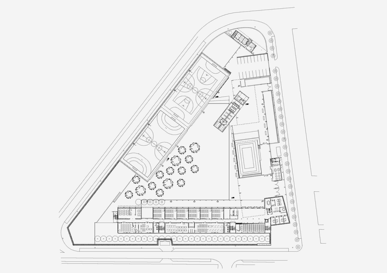The new school is arranged into two buildings that line two residential streets. The triangular site has views facing south-east, towards the open spaces of the Alameda de las Autonomías and the freshwater stream.