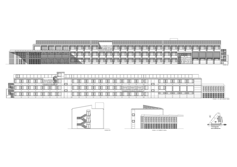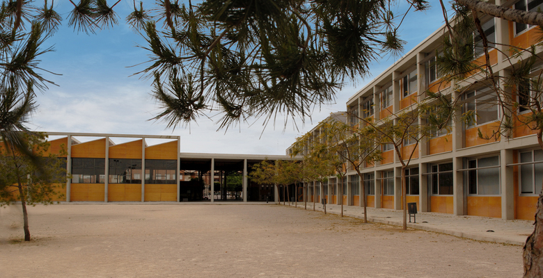 The classroom building is structured linearly over the ground floor and two upper floors. The future planned expansion will extend and totally occupy the front of the site. The north/south orientation of the façade enables the classrooms to be occupied permanently during the day, and the workshops, laboratories and other facilities that are facing north, are used less frequently.