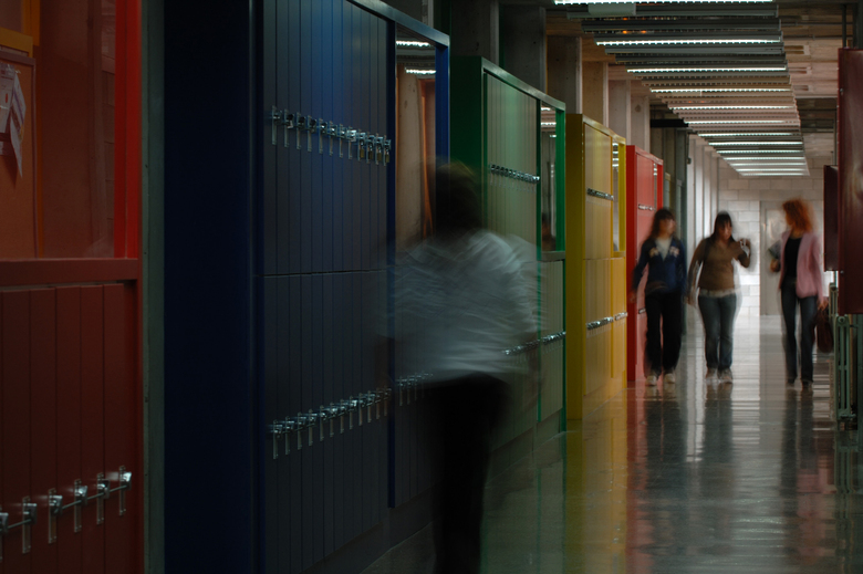 The classroom windows are double glazed with low-emissivity glass, and integral metal venetian blinds. A system of large outdoor shutters makes up an exterior lattice which controls the sunlight in the library.