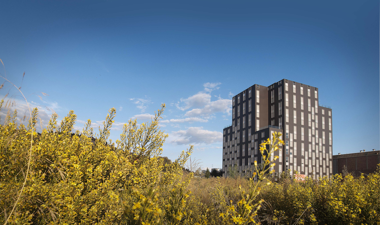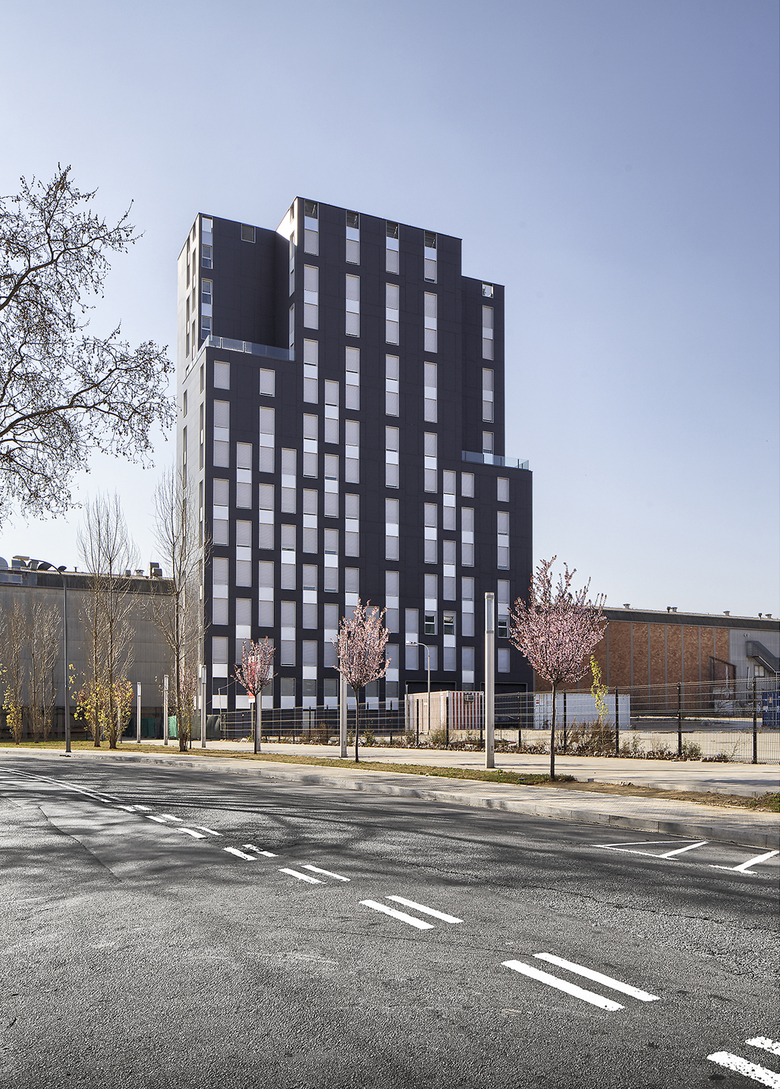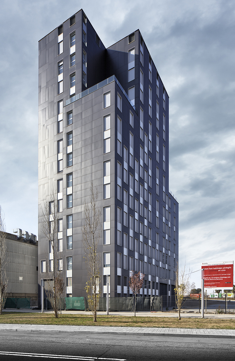This public housing building for young people is located in the Zona Franca neighbourhood of Barcelona in a former industrial block transformed into a service district, “District 38 Barcelona. Business Area”