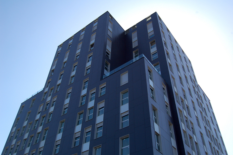 A 12- story, L-shaped building is proposed, arranged around two perpendicular corridors which have natural light and views at each end. These circulation spaces give access to the houses and facilitate inspection to all services and facilities externally. The stair and lift core is located at the junction of the two corridors, and occupies the only floor space that has no façade. The fold of the building forms a courtyard facing south.