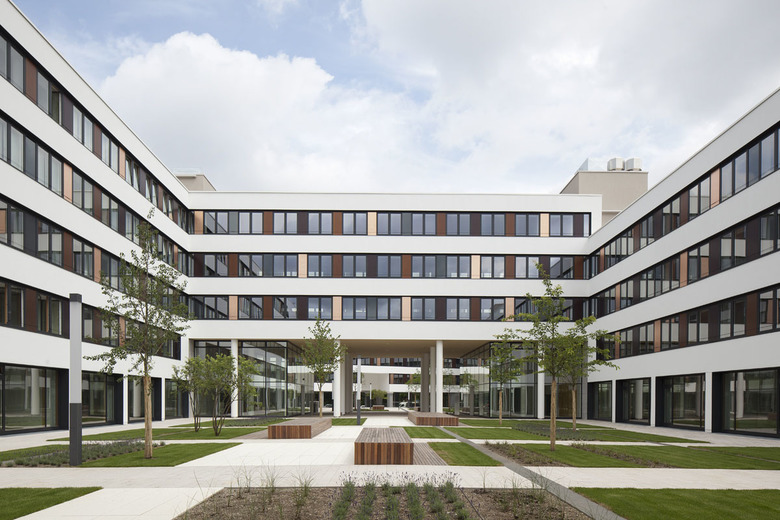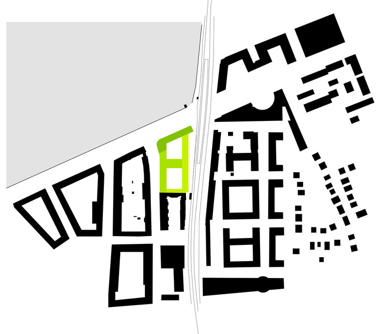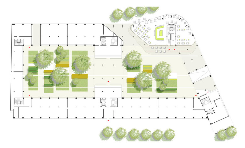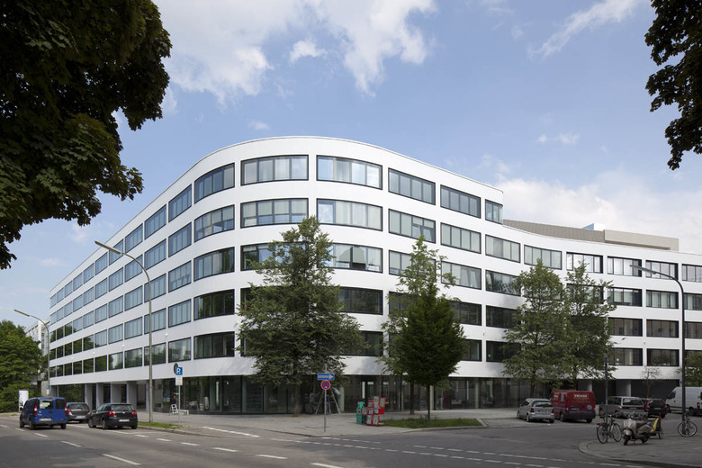 Die städtebauliche Grundidee für den mit Blick auf den Baumbestand des Ostfriedhofs gelegenen Gebäudekomplex sieht vor, die beiden Innenhöfe im Erdgeschoß zur Straße hin zu öffnen und damit eine direkte Durchwegung zur S-Bahn zu ermöglichen. Somit entsteht im Gebäude eine öffentliche Plaza, deren hochwertige Gestaltung in Verbindung mit Läden und Café zum Verweilen einlädt.