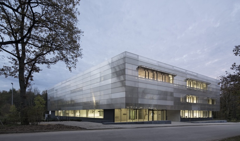 Das städtebauliche Konzept führt den Masterplan für den Science Park am Oberen Eselsberg fort, in dessen geplante Bebauung sich das neue Helmholtz-Institut harmonisch einfügt. Das Konzept des dreigeschossigen Forschungs- und Laborgebäudes basiert auf einem modularen Aufbau. An den Außen- und Innenhoffassaden im Westen liegen Großräume, die nach Bedarf in mehrere Labore unterteilt werden können. Die offene Struktur ist in der Lage, mit geringem Aufwand auf die individuellen Anforderungen künftiger Forschergruppen flexibel zu reagieren. Nebst allgemeinen chemischen und physikalischen Laboren gibt es Sonder- und Speziallabore im Erd- und Untergeschoss, darüber sind Büros angeordnet. Zum Innenhof orientierte Flurfenster bieten optimale Belichtung und Ausblick. Zentrale Kommunikationsflächen bieten Raum für den Forschungsaustausch. Über das Erdgeschoss ist auch der Innenhof zugänglich, zu dessen heller, einladender Atmosphäre sich auch die Seminar- und Besprechungsräume orientieren. In der homogenen äußeren Fassadenebene aus Lochblechelementen entsteht durch verschieden große Lochungen ein spannendes Muster optischer Interferenzen.