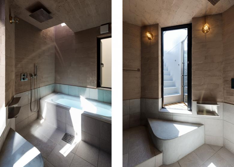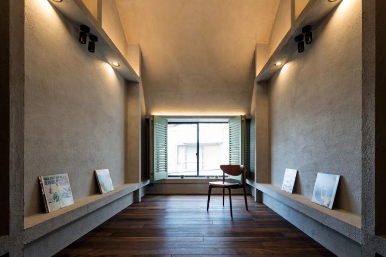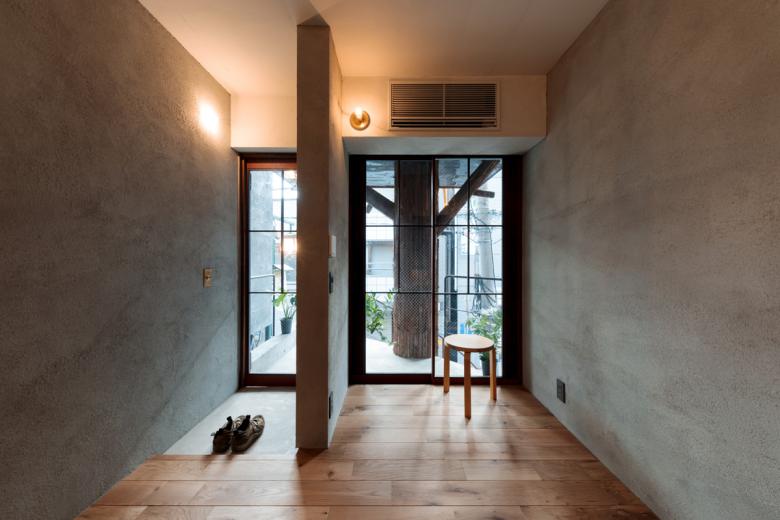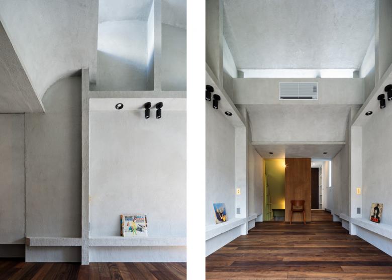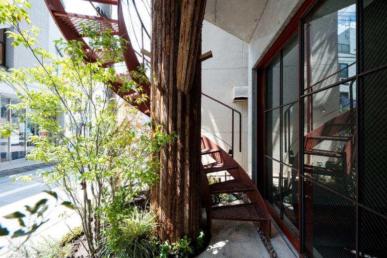 The first and second floors are RC, and the third floor is made of wood to reduce the weight of the structure, while the columns and external staircase that support the third floor are enlarged to serve as a boundary between the town and the living space.