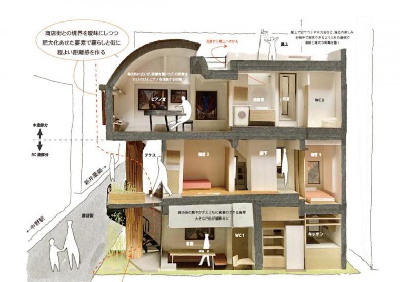 This is a three-story house planned for a shopping street in Nakano Ward.