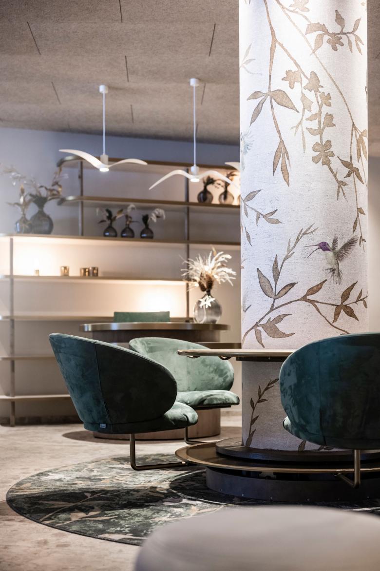 The entrance and reception area of the hotel retain their original layout but are given a new look. Here, the presence of numerous pillars inspired a new design language characterised by round shapes, bright colours and decorations referencing the flora and fauna of the forest. Finally, a cosy space with swings and merry-go-rounds for the little ones is flanked by a lounge for parents.