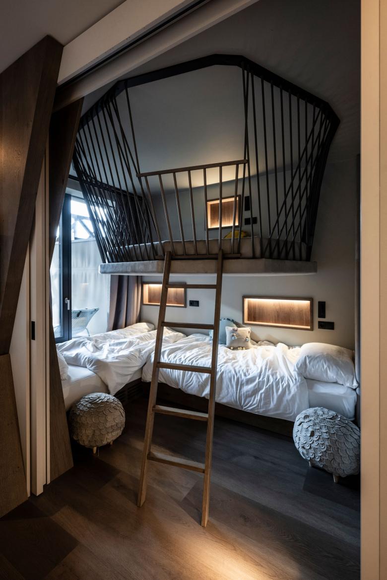 “In the children’s area there are always three beds available, one of which, suspended from the ceiling, is a kind of nest-bed inspired by falcon which is the symbol of the hotel. Even when it is not occupied, it is always an opportunity for the little ones to play and have fun,” concludes interior architect Caterina Betti.