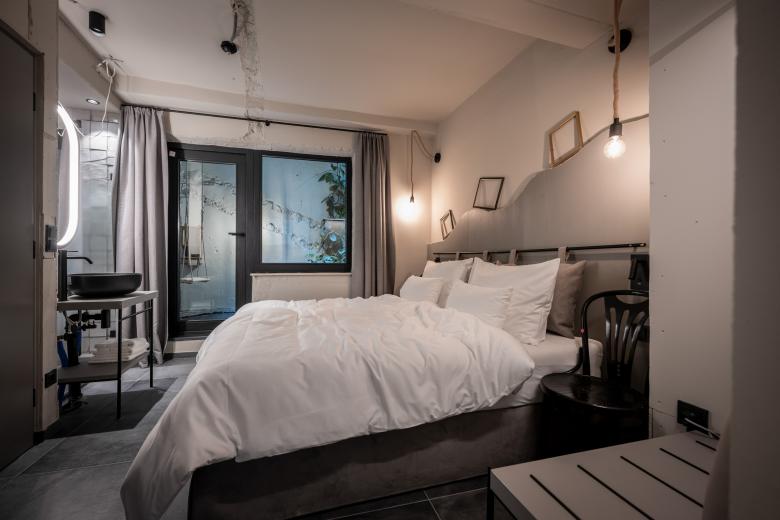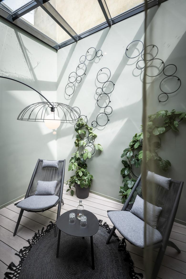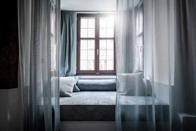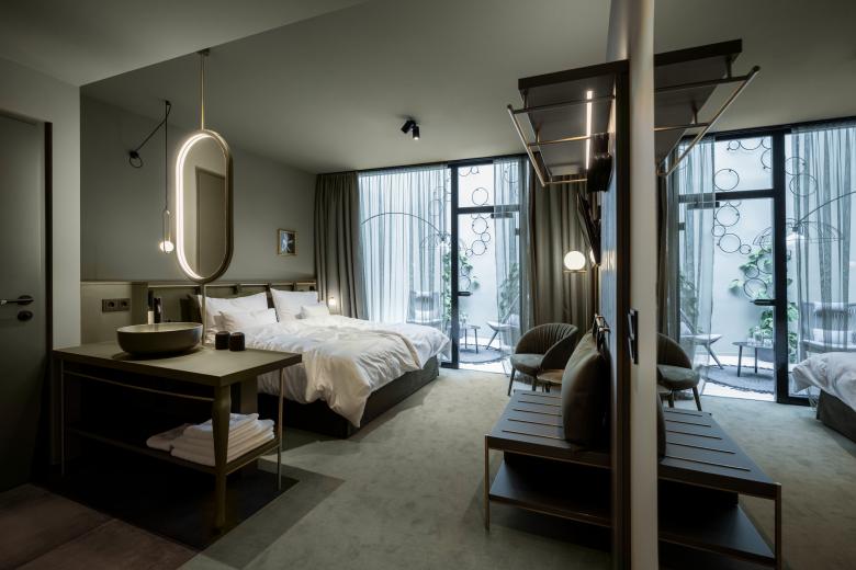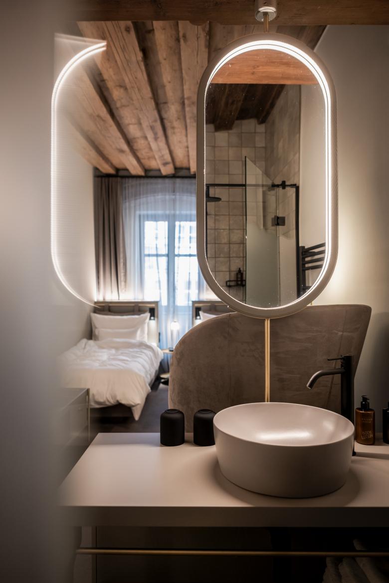 The new rooms and suites – or “chambers”, as the owners affectionately call them – are located on the floors below. Despite the architectural irregularity of these existing floors, with their gothic ceilings, arches and varying room heights, noa* has succeeded in bringing some kind of calm to the madness. The guest rooms facing the street allow you to engage in the hustle and bustle of Innsbruck's old town just by looking out of the window, while those facing the inner courtyard delight with an internal patio or balcony creating a secluded idyll. For the windowless central part of the building, noa* has devised a particularly ingenious way to make use of the space here while allowing these rooms to receive natural light. They are lit via an internal courtyard between the first and sixth floors and have a small private, landscaped terrace.