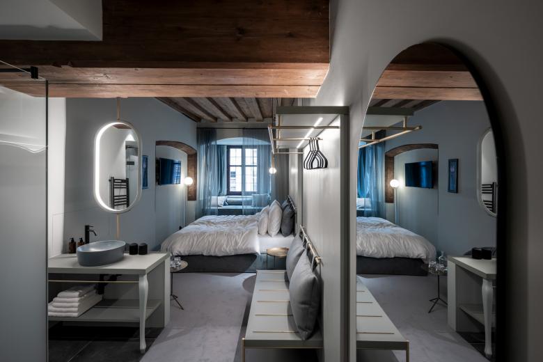It is not only irregular forms that evoke history. Murals discovered during the project tell stories whose authors remain unknown. The Weisses Kreuz is making a fresh start with a new concept, and at the same time it is full to the brim with surprises and secrets. The dreams and anecdotes of times gone by extend all the way to the loft, whose glass openings put the starry sky within reach.